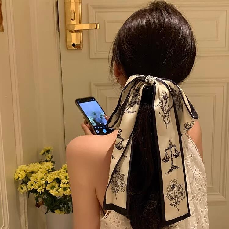 スカーフ風のリボンに、花と天秤の繊細なイラストが描かれた個性的でアーティスティックなヘアアクセサリーお得な2色セットです✨