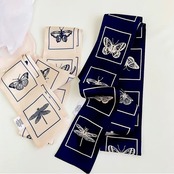 昆虫の繊細なイラストが整然と並ぶデザイン、とてもユニークでスタイリッシュですね。上品さと個性をあわせ持つこのスカーフです。
