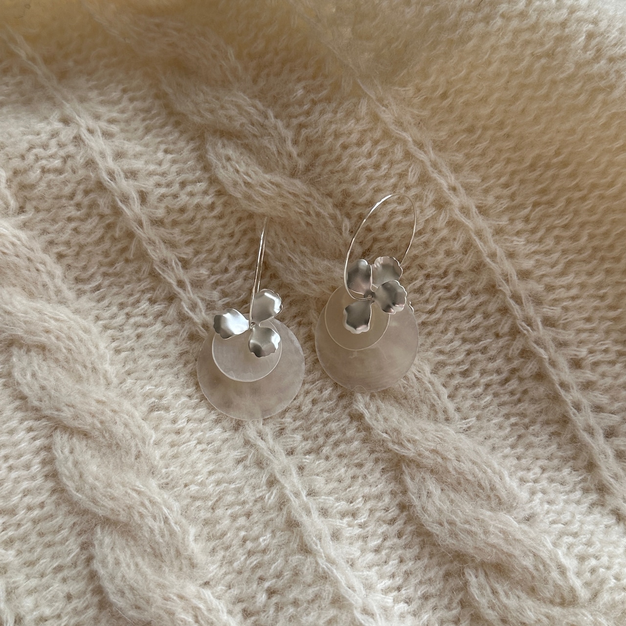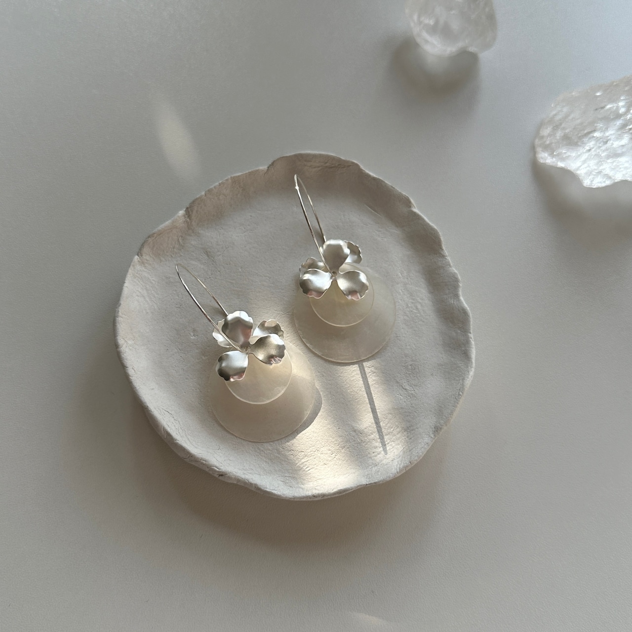 軽やかな空気を纏うような、透明感あふれるデザイン。透け感のあるパーツと柔らかな光沢のフラワーデザインがとても繊細で美しいピアス