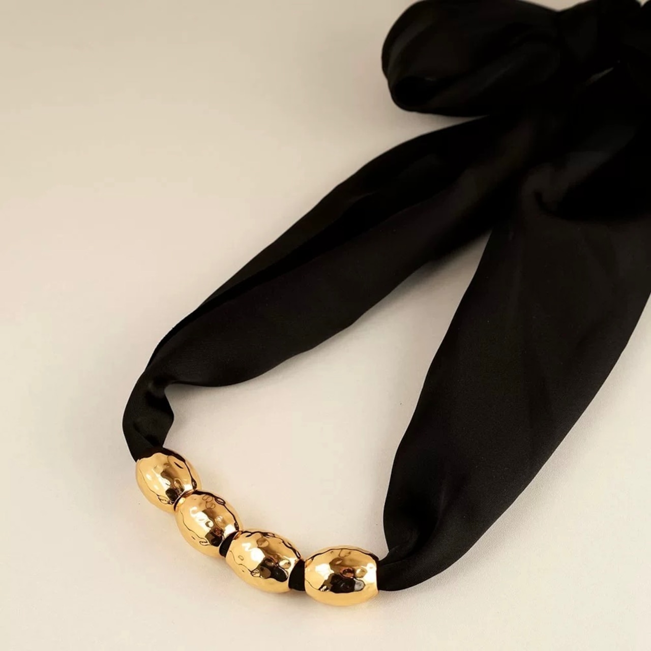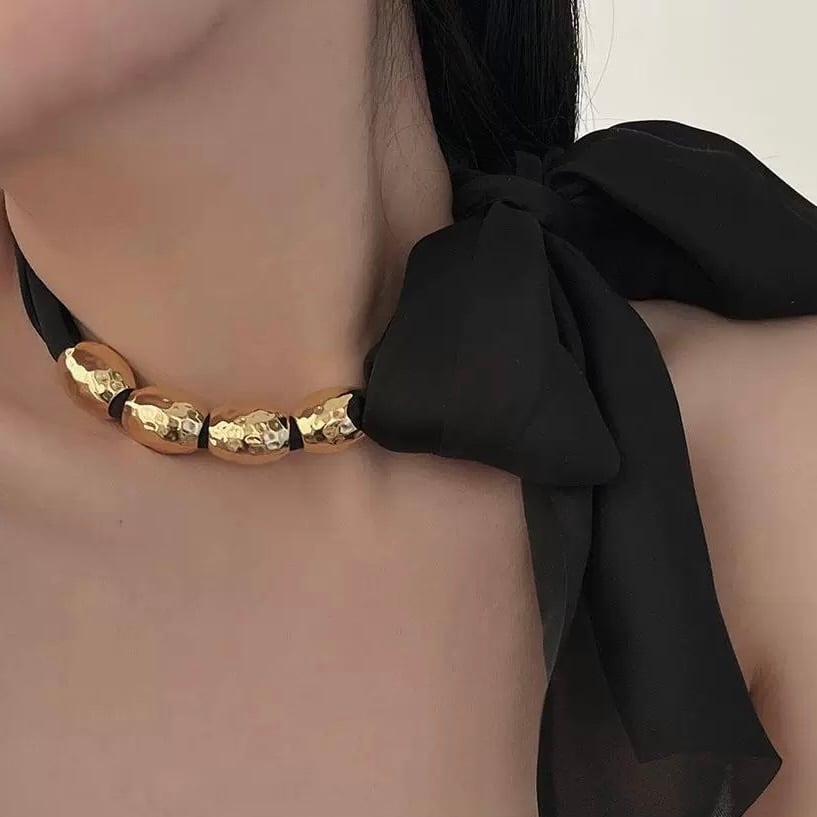 光沢感のあるリボンスカーフと、艶やかなメタルビーズが織りなす、リュクスなネックレス。