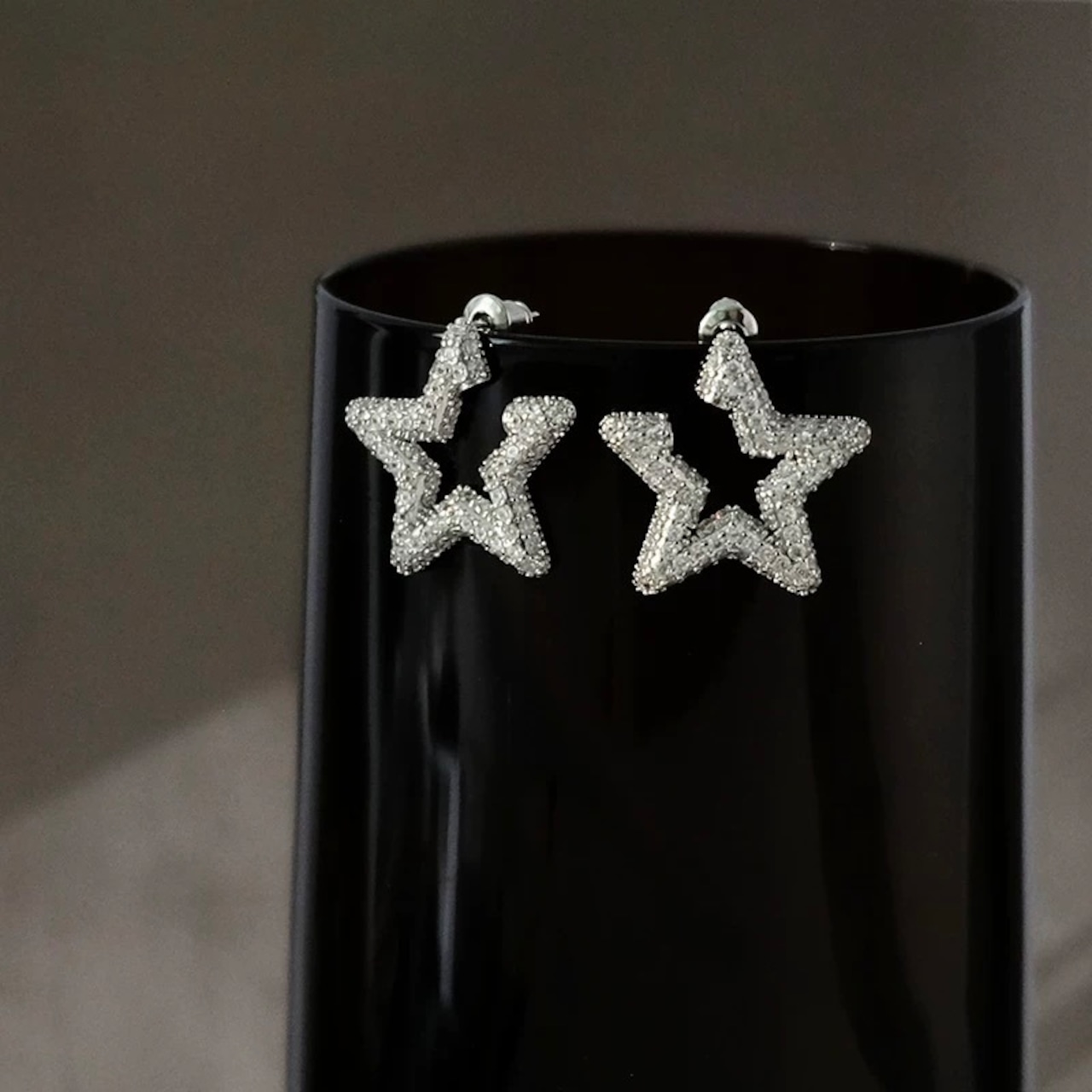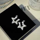 無数のストーンが星形にきらめく、印象的な立体デザインのピアス。