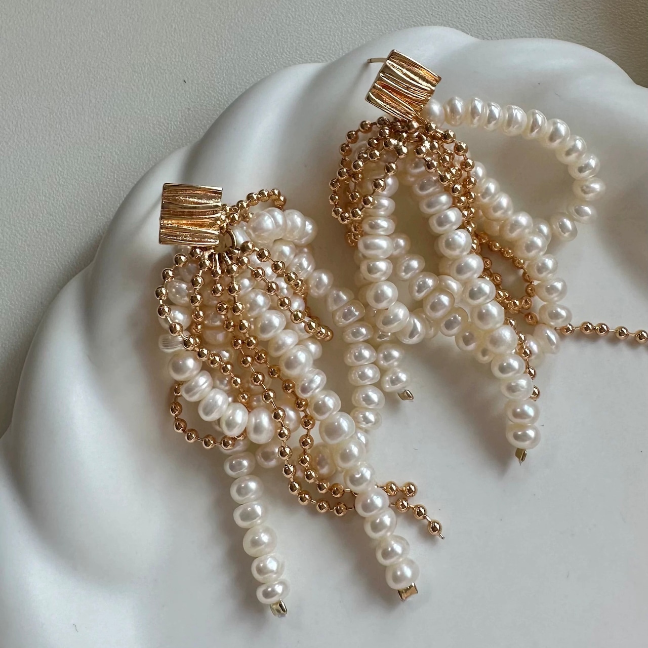 可憐なパールとゴールドビーズが揺れ動く、上品な存在感を放つハンドメイドピアス。天然の淡水パールを贅沢に使用し、洗練されたフランス風デザインが横顔を華やかに演出します。カジュアルからドレスアップまで、シーンを問わず活躍する万能アイテムです。