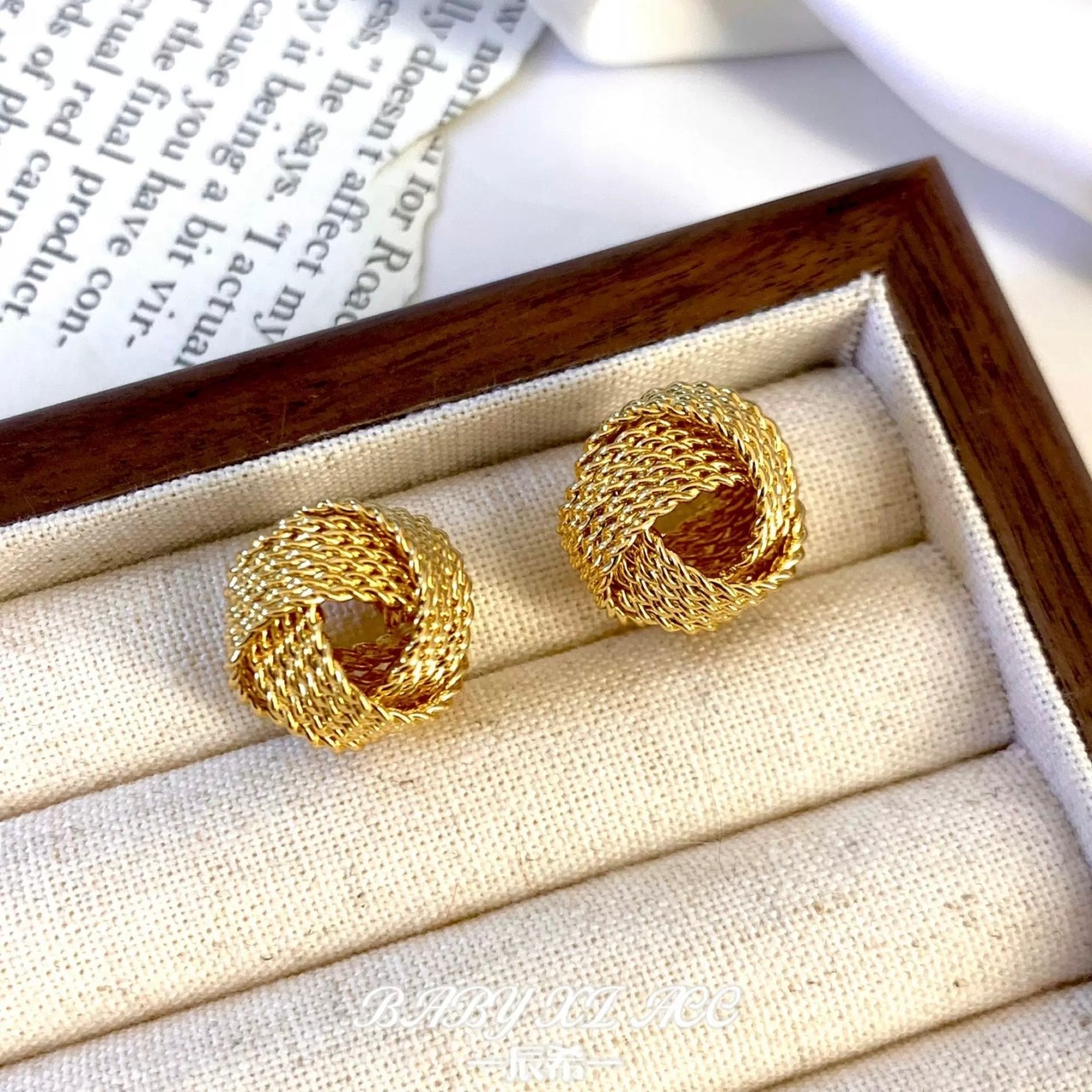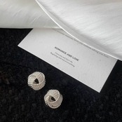 立体的な編み込みデザインが目を惹く、メッシュノット風ピアス。洗練された丸みと繊細な編み模様が、横顔にさりげない華やぎを添えてくれます。