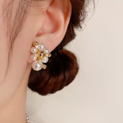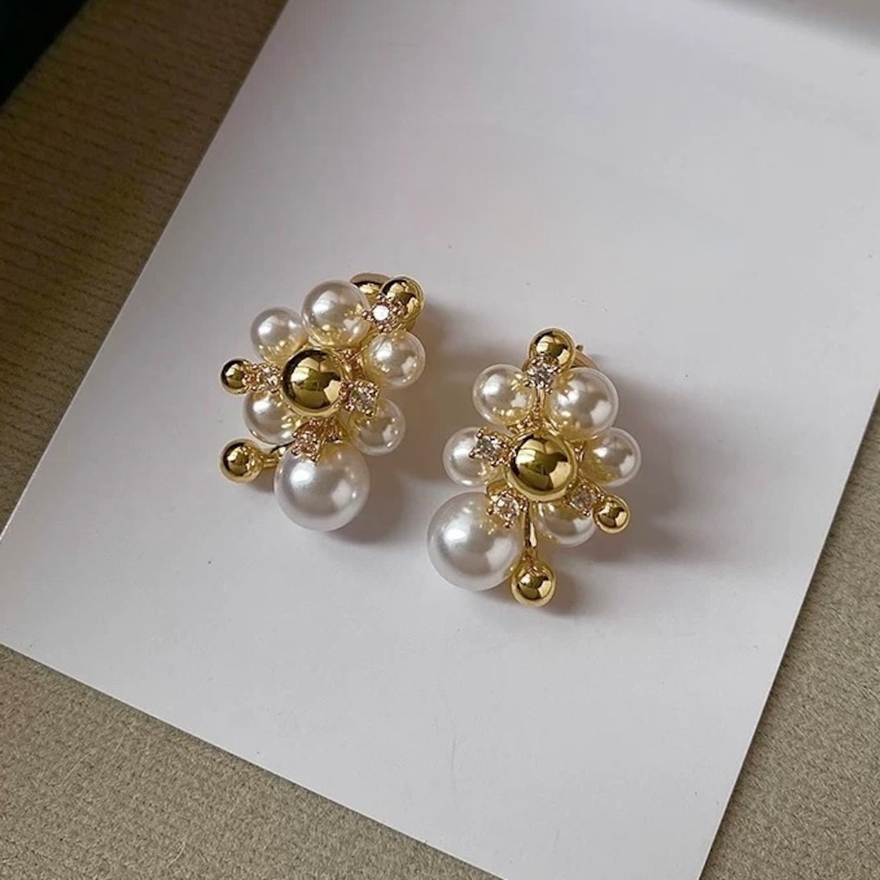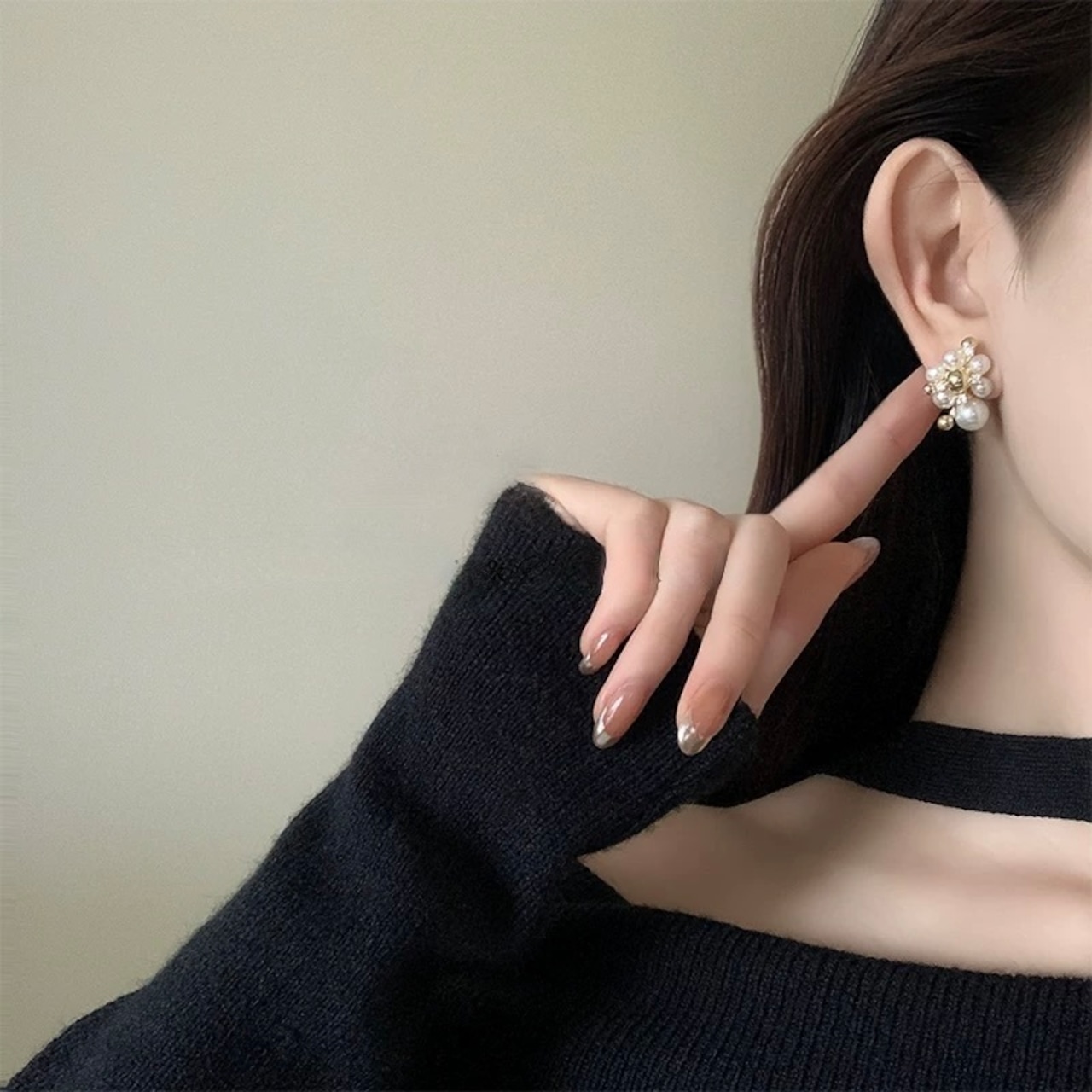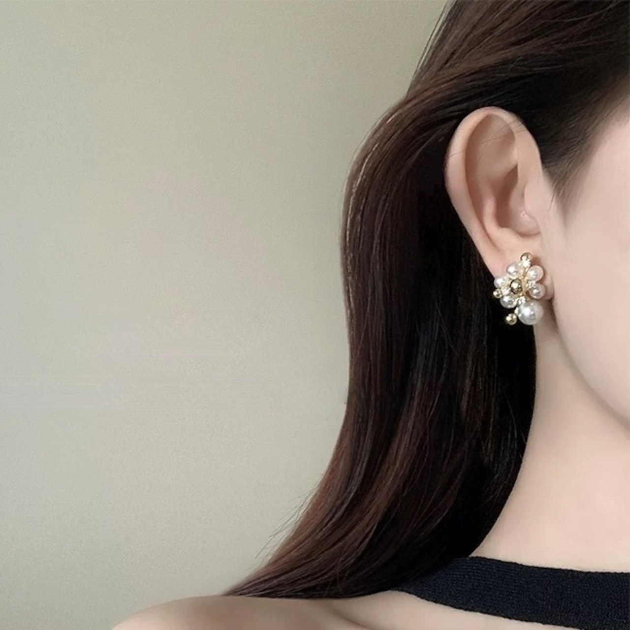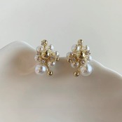 繊細な花々が耳元でそっと咲き誇る「ブロッサムパールピアス」。可憐な小花のように配置されたフェイクパールとジルコンが、柔らかな光をまとって上品な華やかさを演出します。立体感のあるフォルムは横顔まで美しく彩り、身に着けるだけで洗練された印象に。大人の可愛らしさと気品を兼ね備えた、心ときめく一品です。