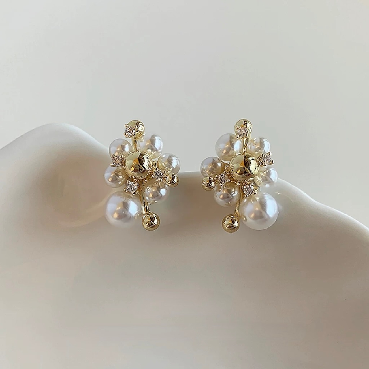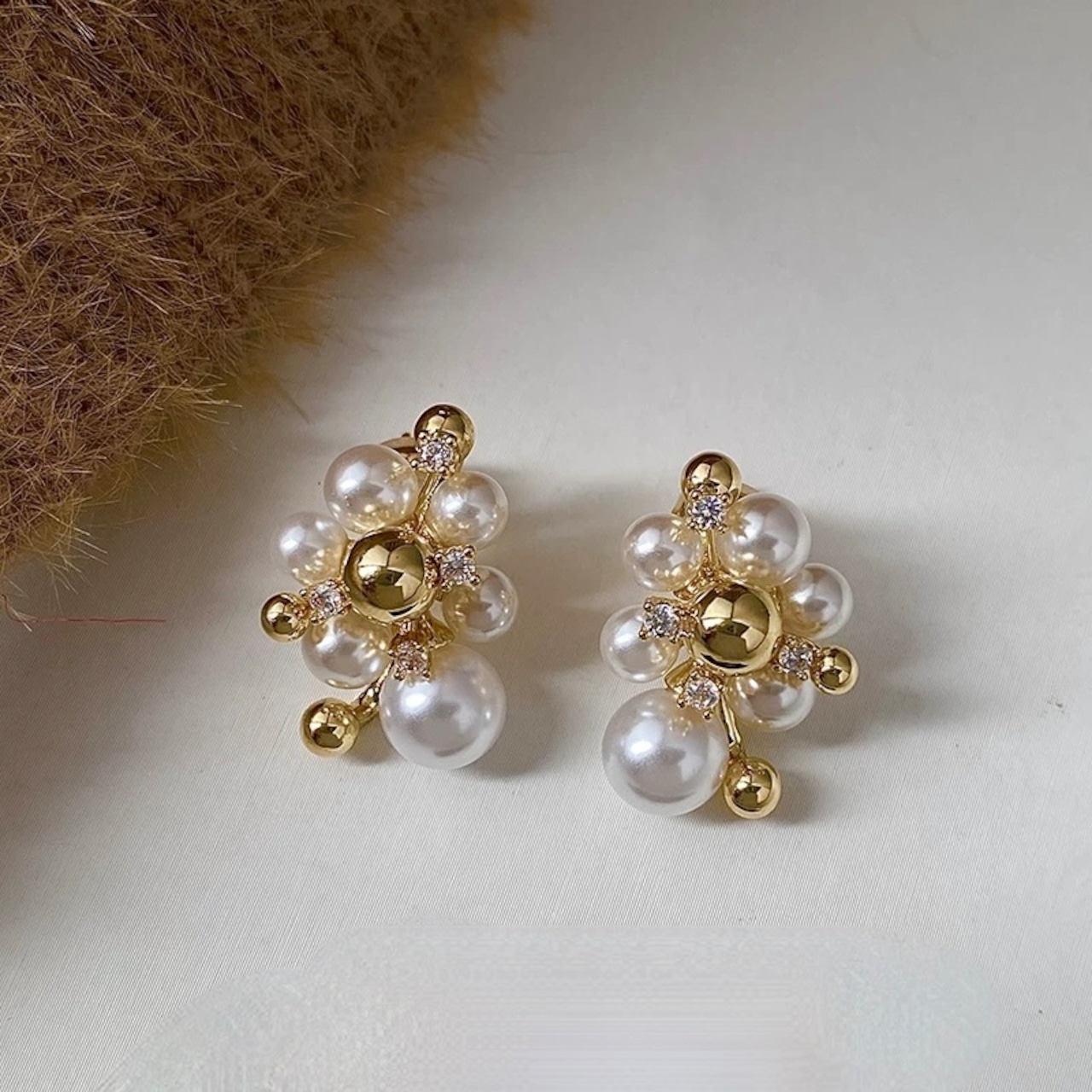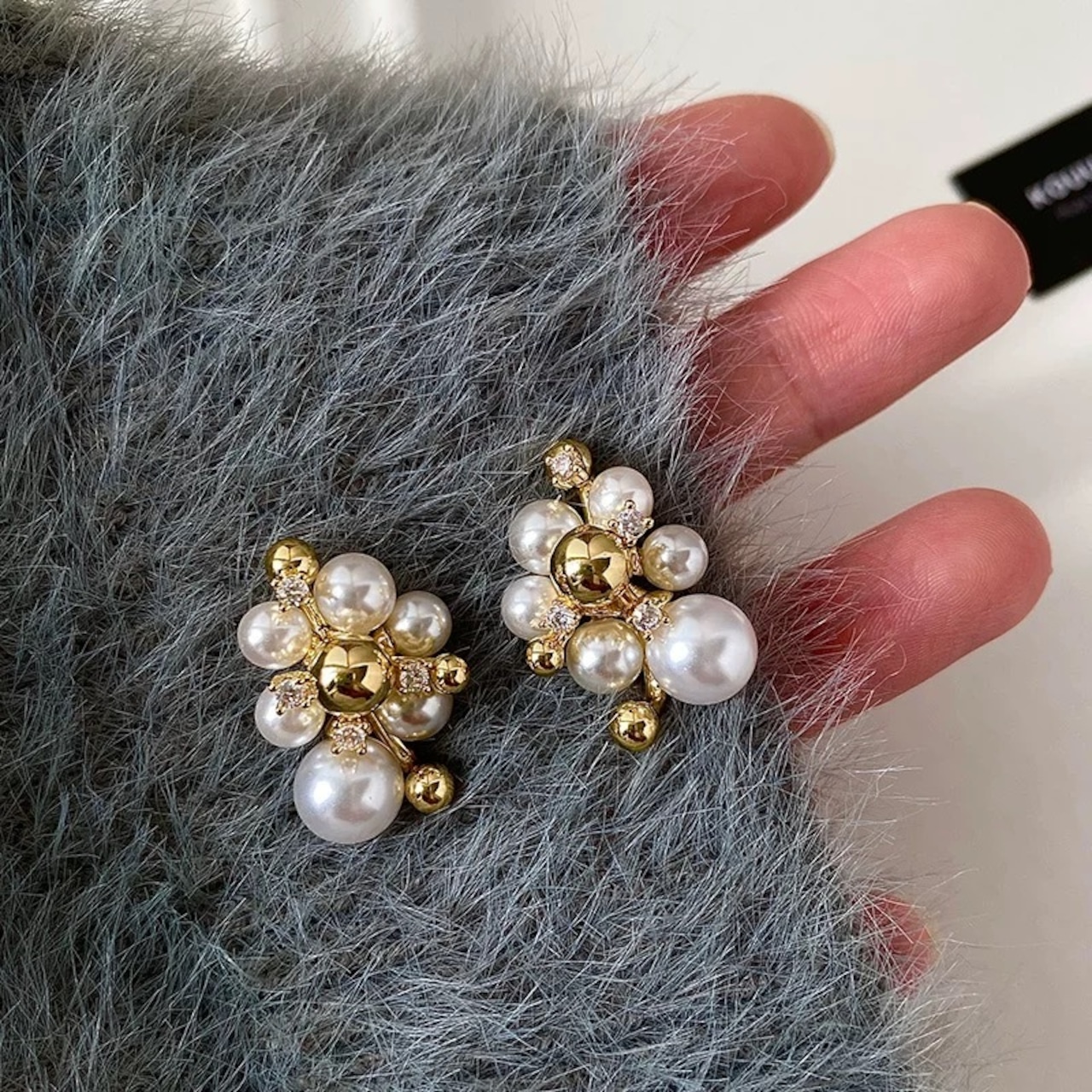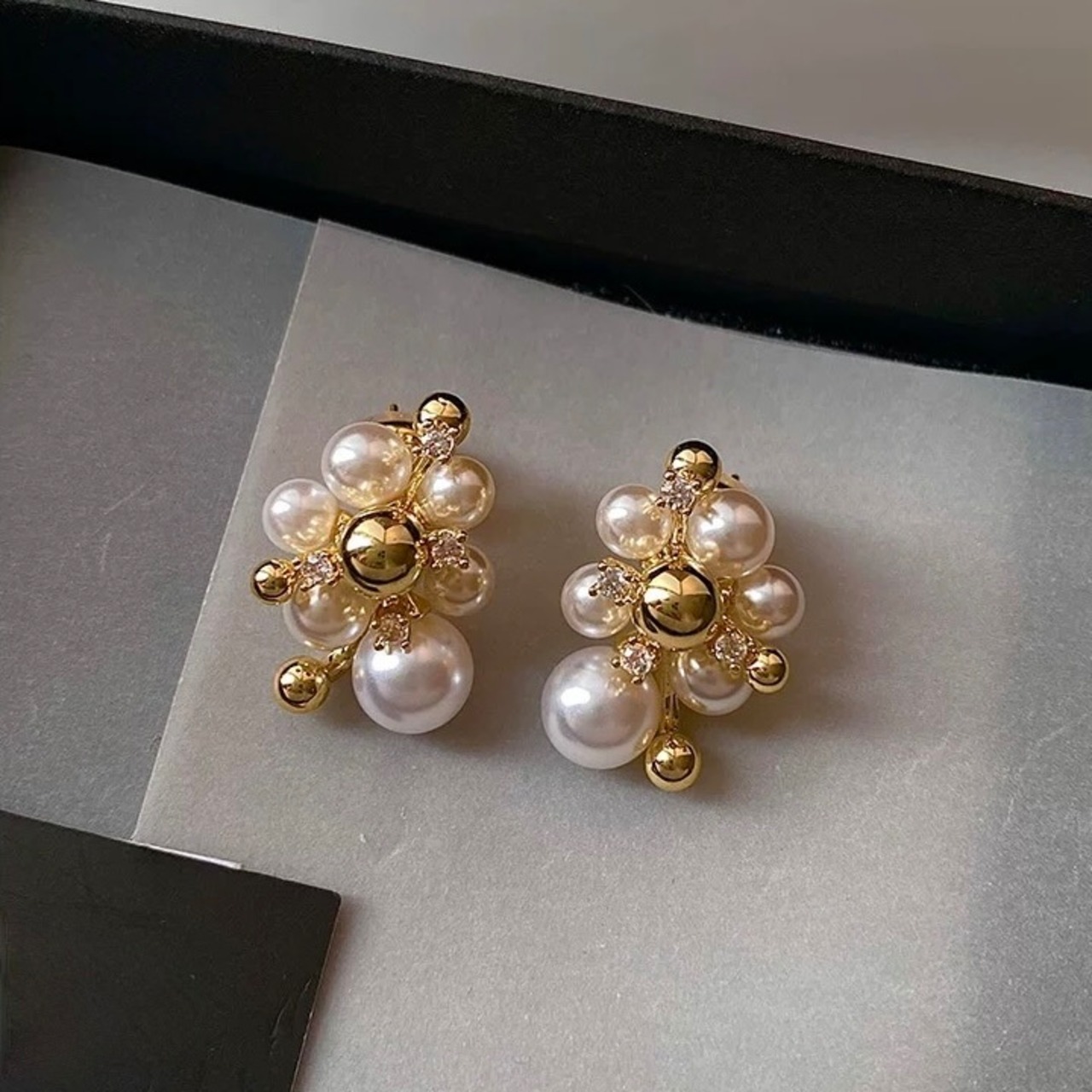 繊細な花々が耳元でそっと咲き誇る「ブロッサムパールピアス」。可憐な小花のように配置されたフェイクパールとジルコンが、柔らかな光をまとって上品な華やかさを演出します。立体感のあるフォルムは横顔まで美しく彩り、身に着けるだけで洗練された印象に。大人の可愛らしさと気品を兼ね備えた、心ときめく一品です。