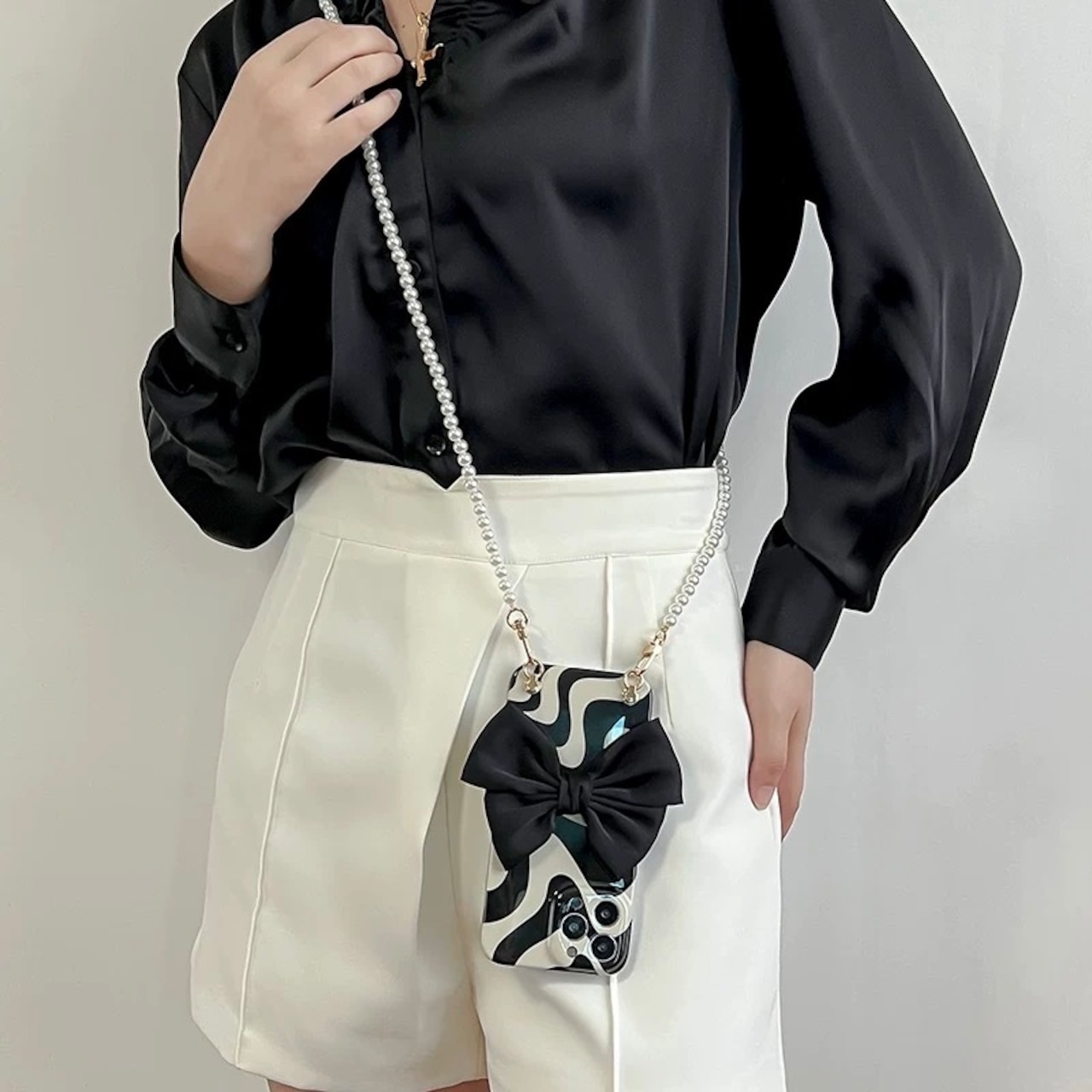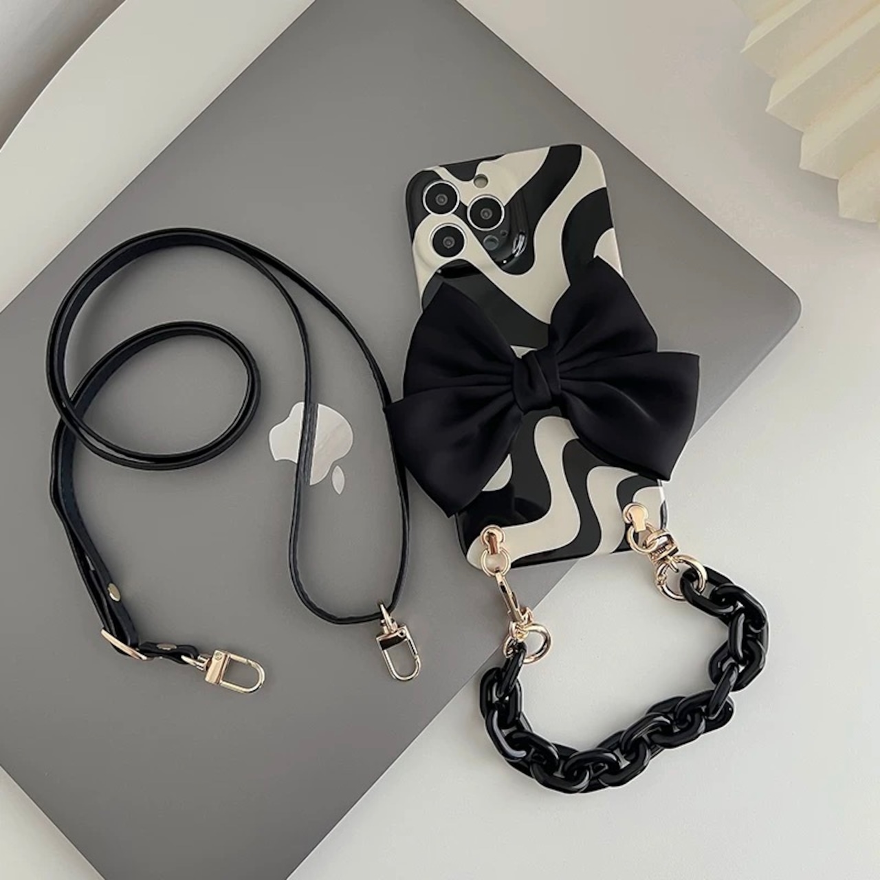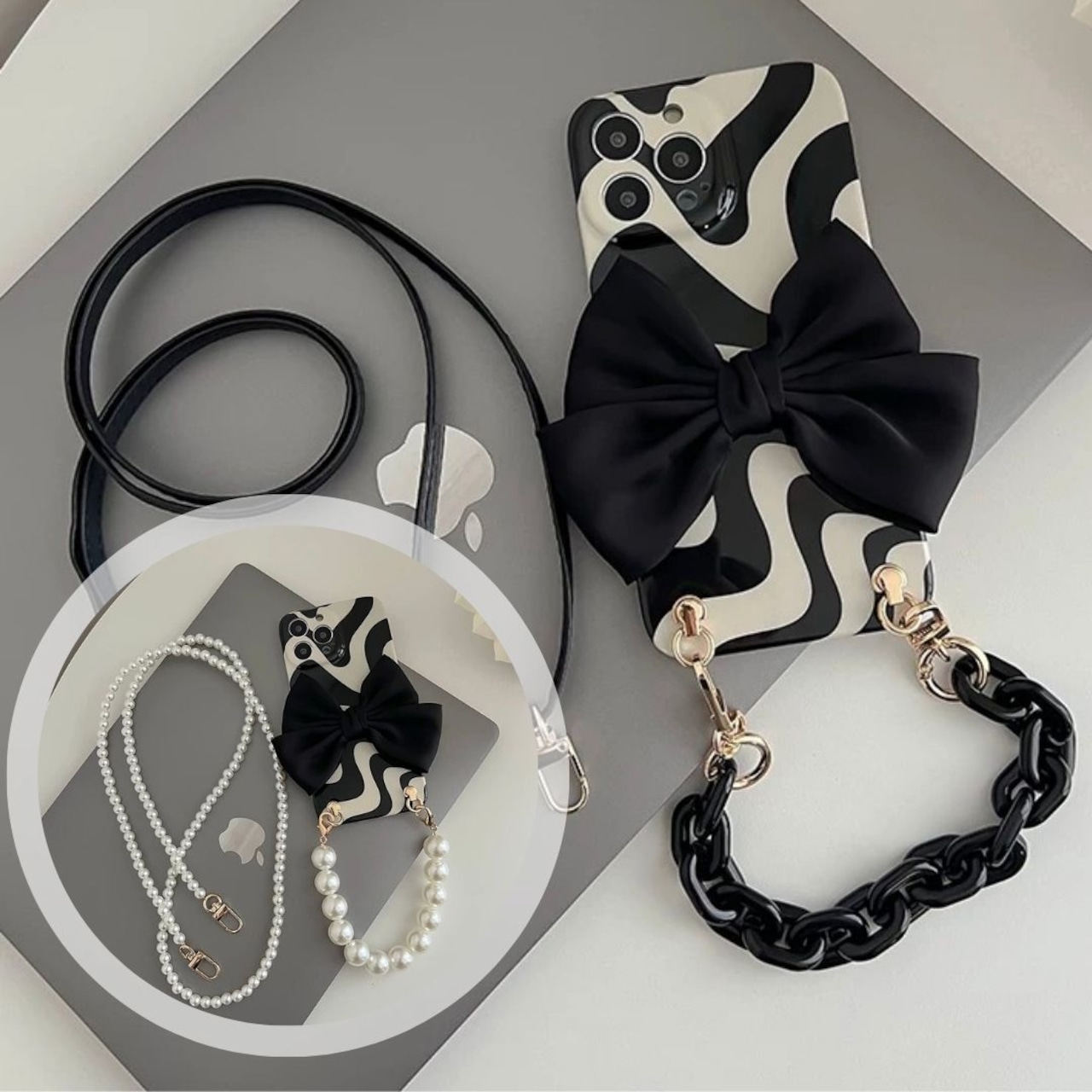 シックなモノトーンデザインのiPhoneケースに、ショルダーとハンドストラップを加えた3点セット。お出かけからパーティーシーンまで幅広く活躍します。実用性とデザイン性を兼ね備えたアイテムです。