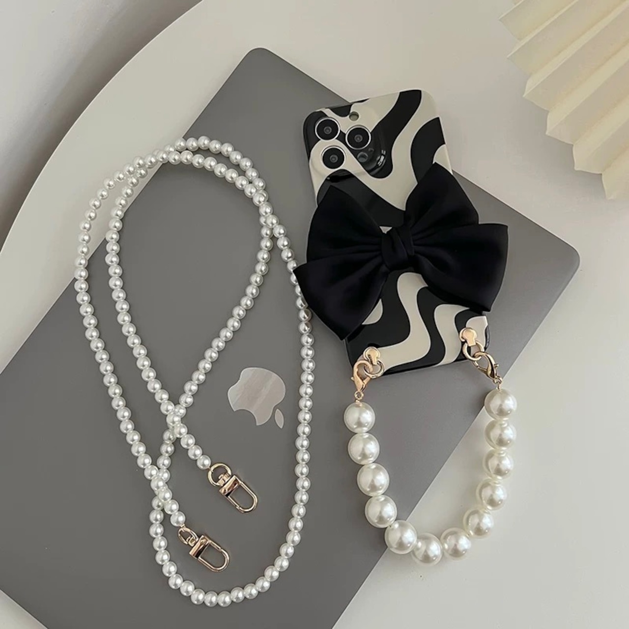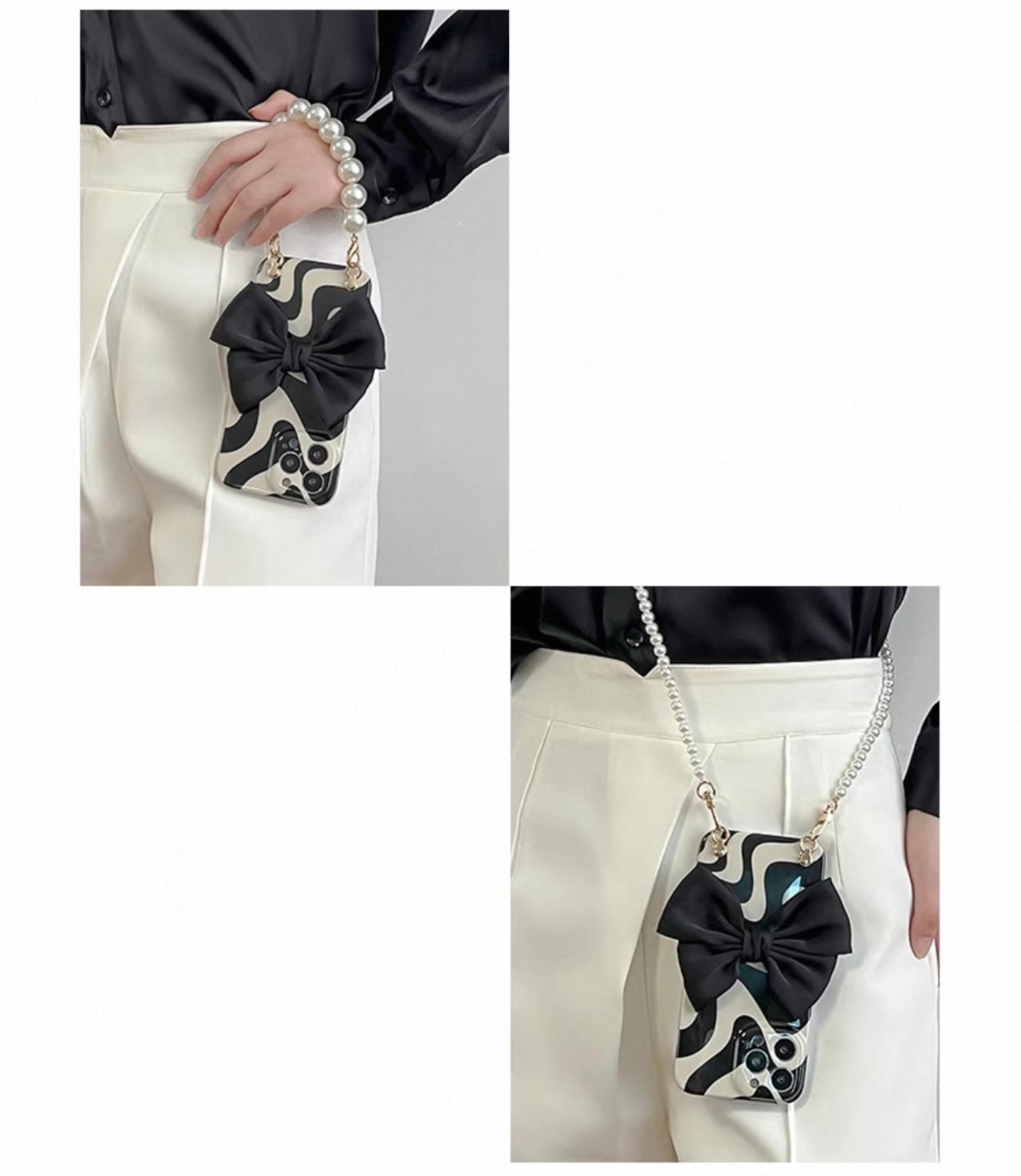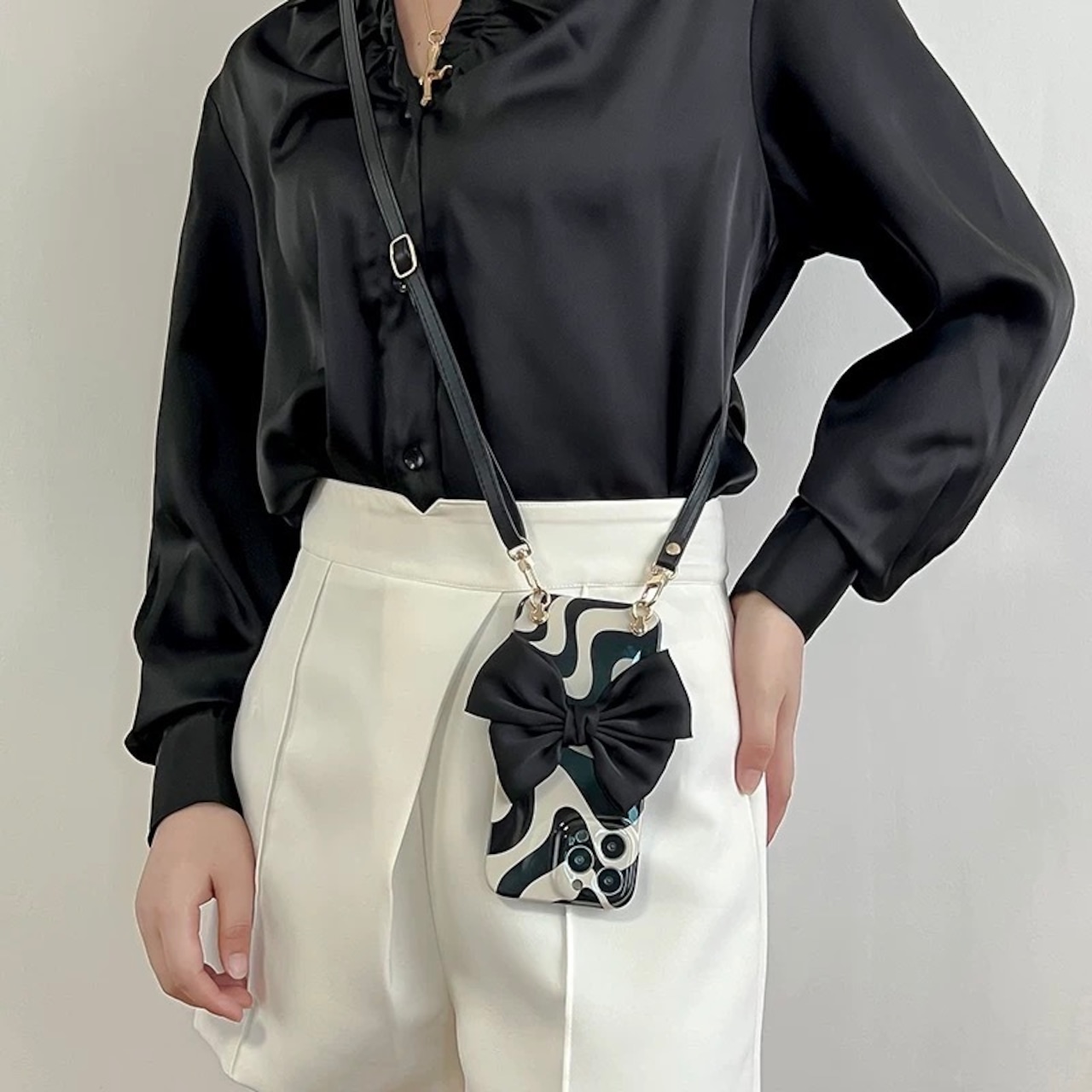 シックなモノトーンデザインのiPhoneケースに、ショルダーとハンドストラップを加えた3点セット。お出かけからパーティーシーンまで幅広く活躍します。実用性とデザイン性を兼ね備えたアイテムです。