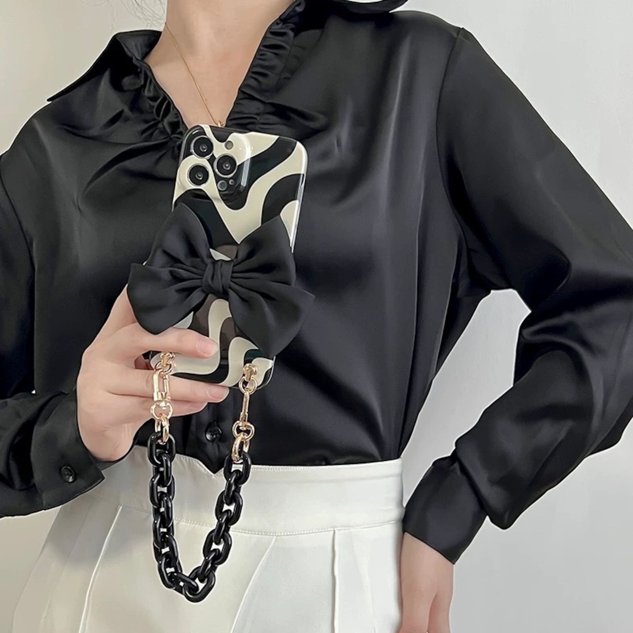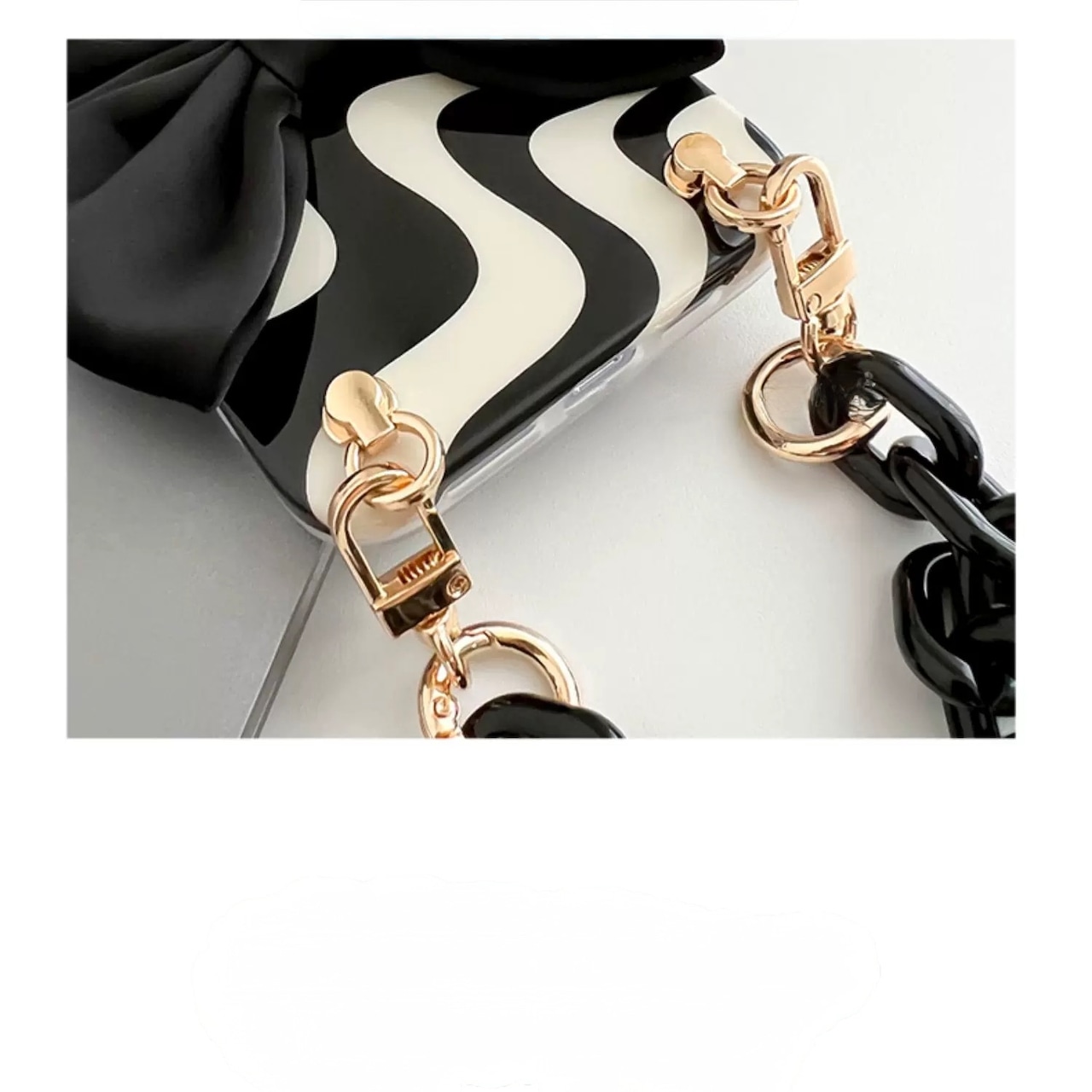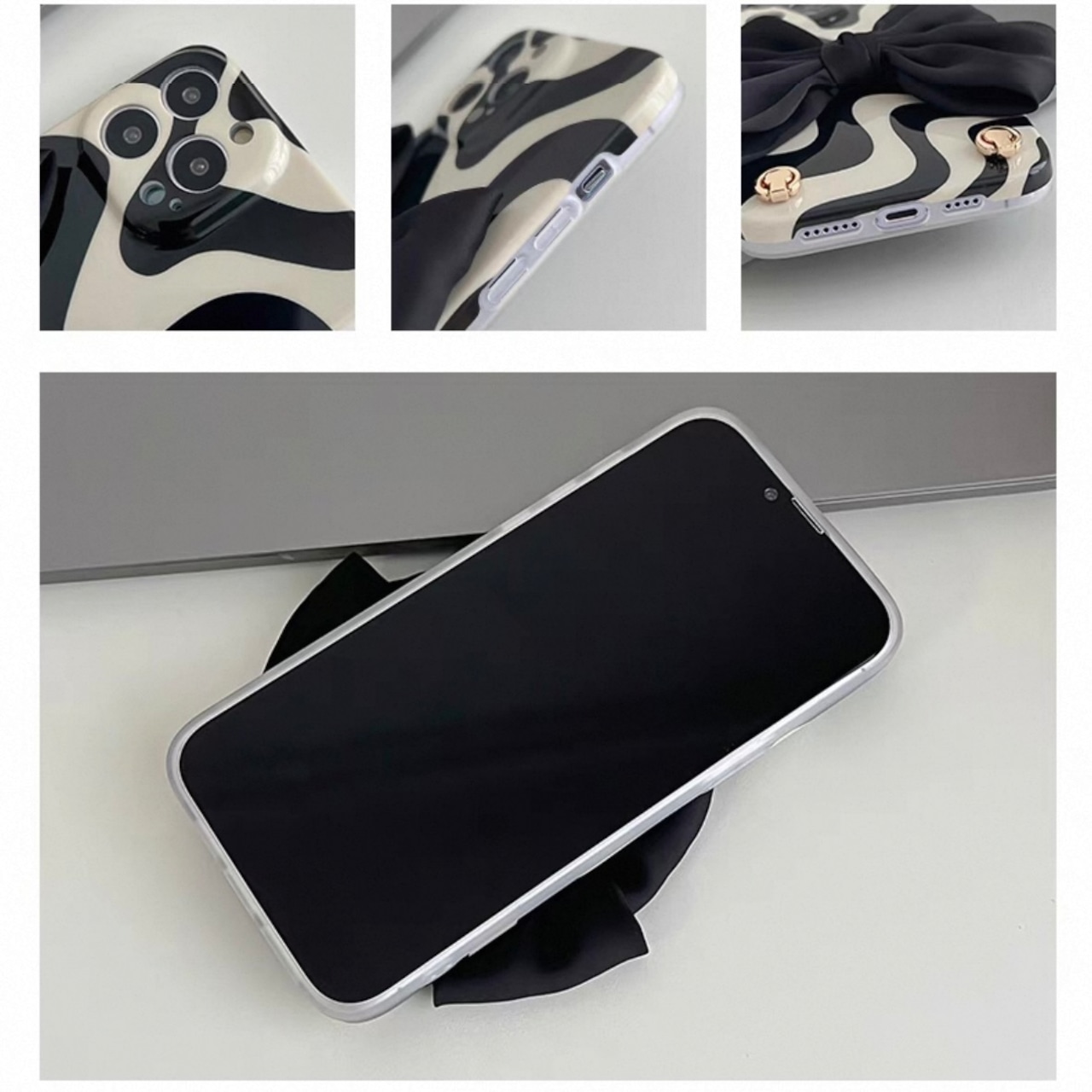 クラシカルなモノトーンゼブラ柄に、大ぶりのブラックリボンが印象的なiPhoneケース。