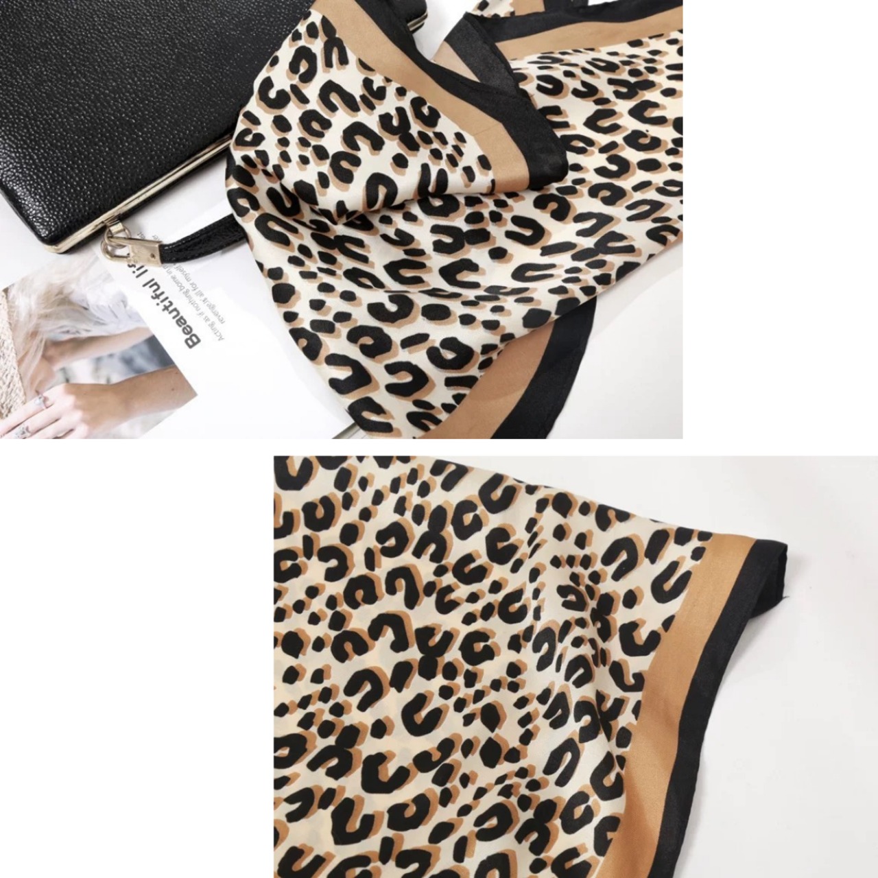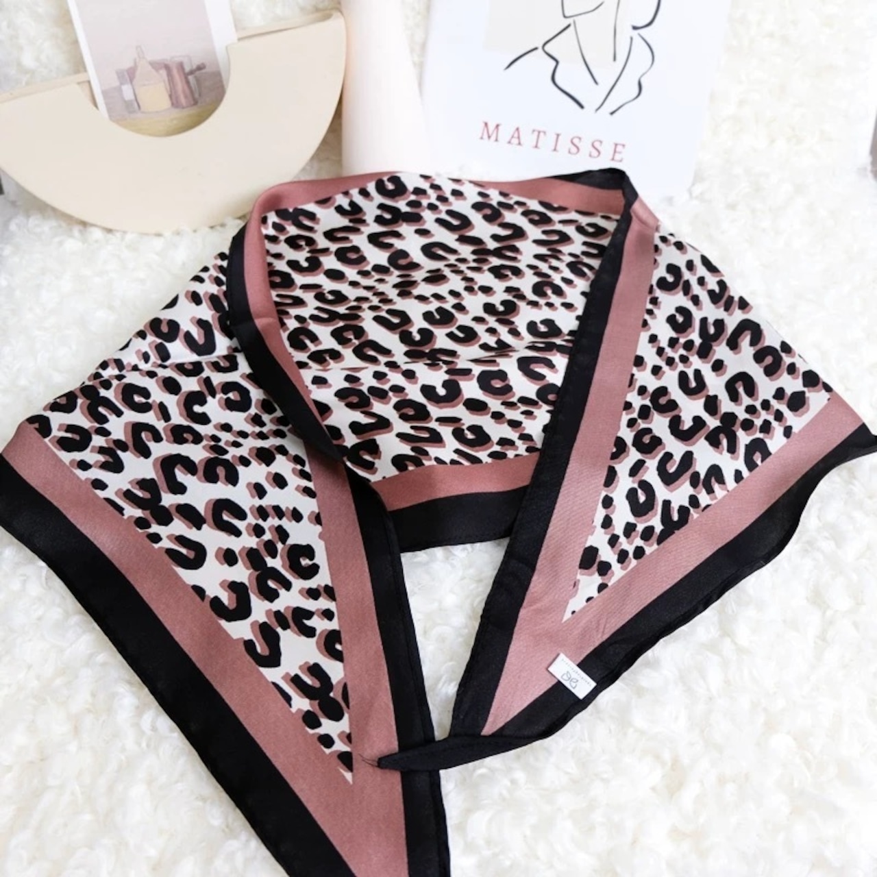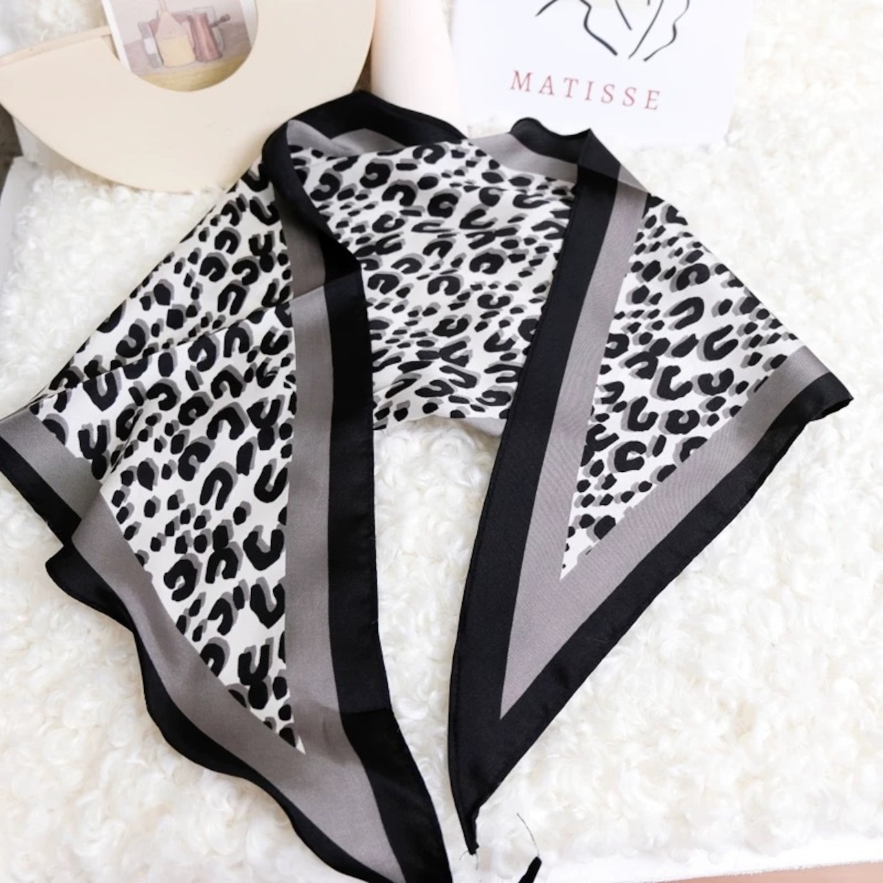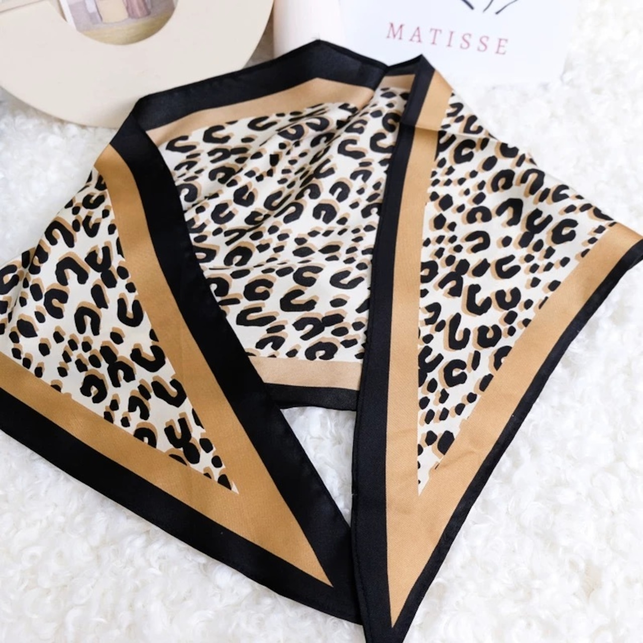今年のトレンド、レオパード柄を取り入れたトライアングルスカーフ。