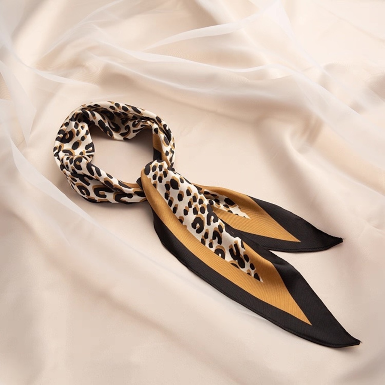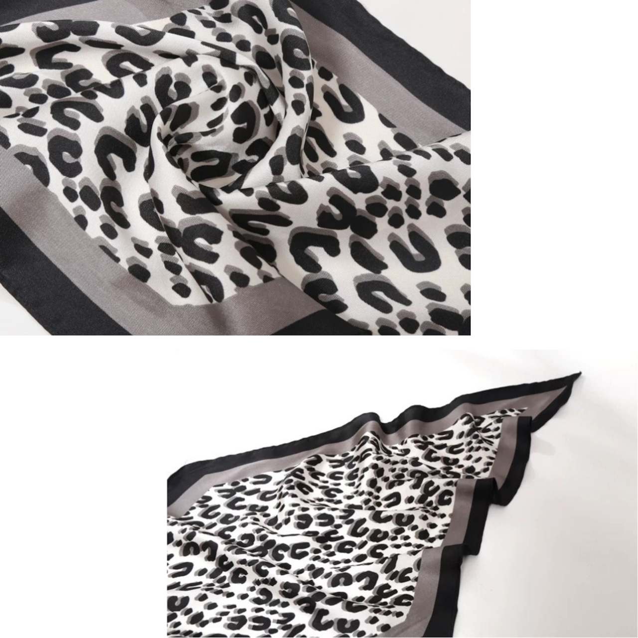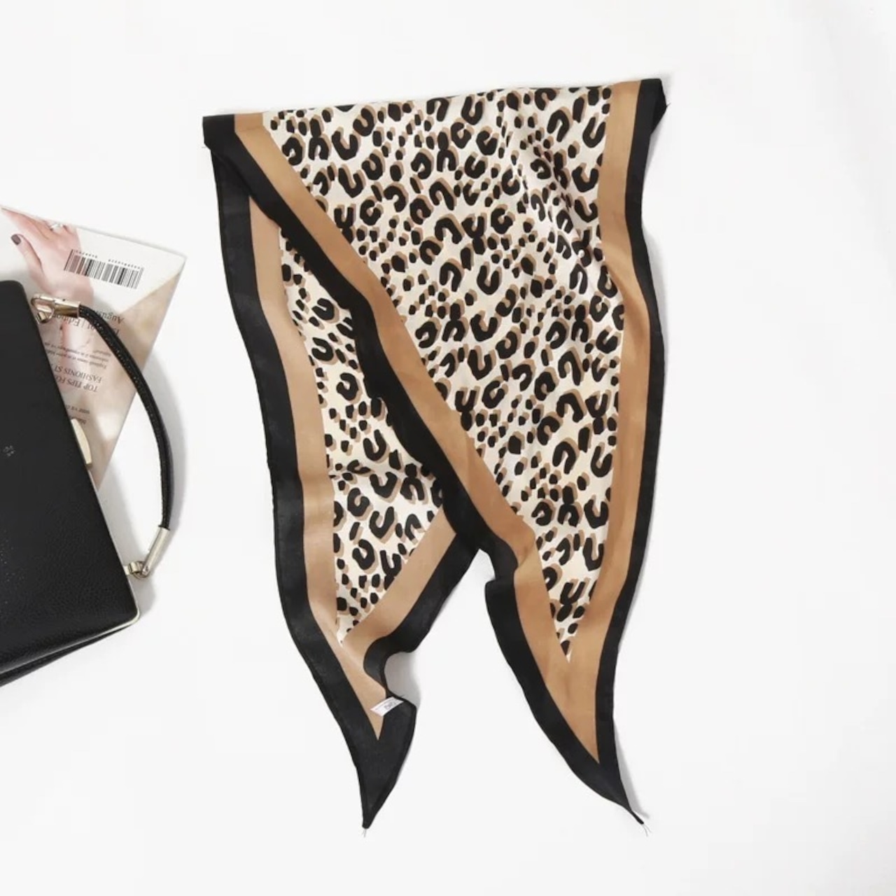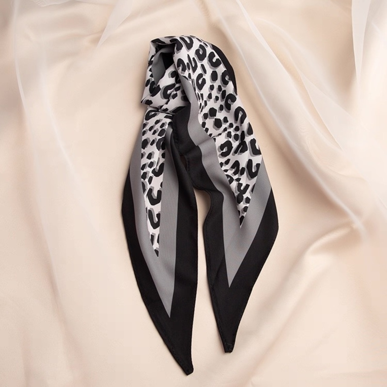 今年のトレンド、レオパード柄を取り入れたトライアングルスカーフ。