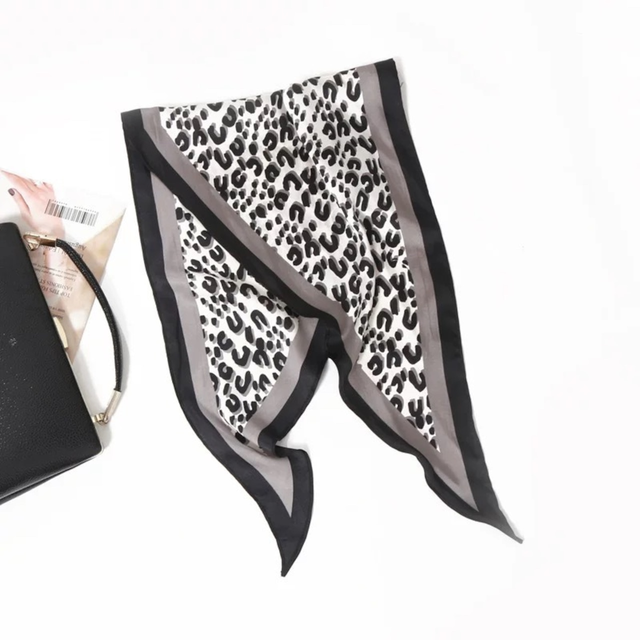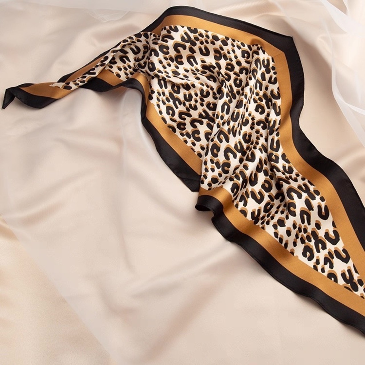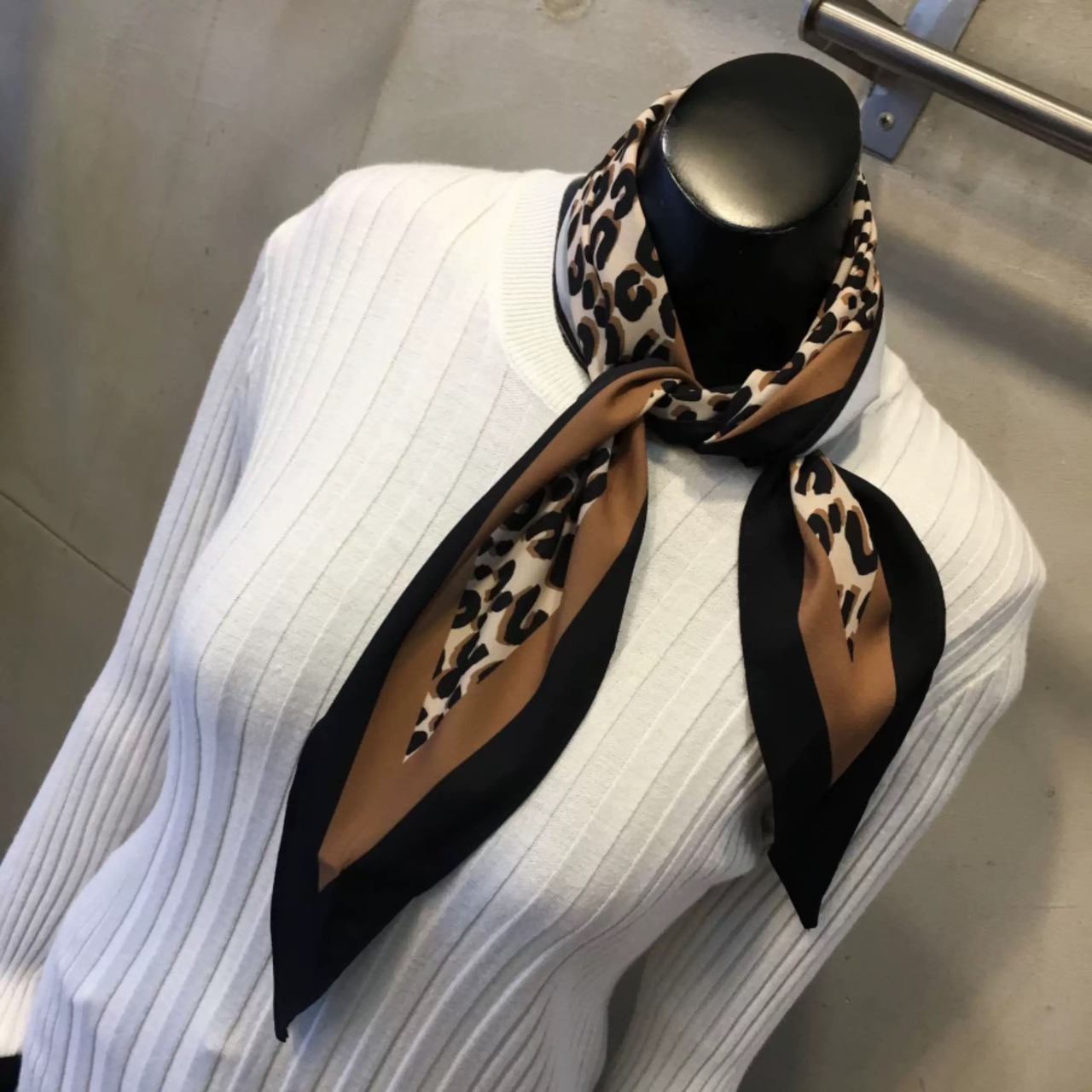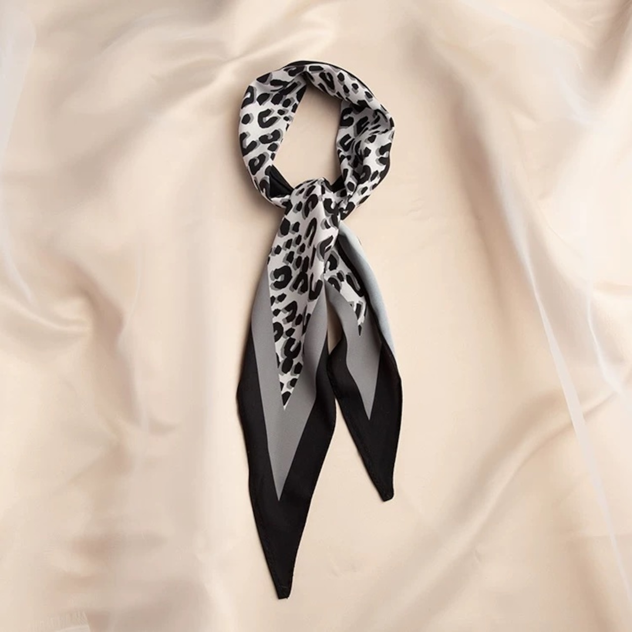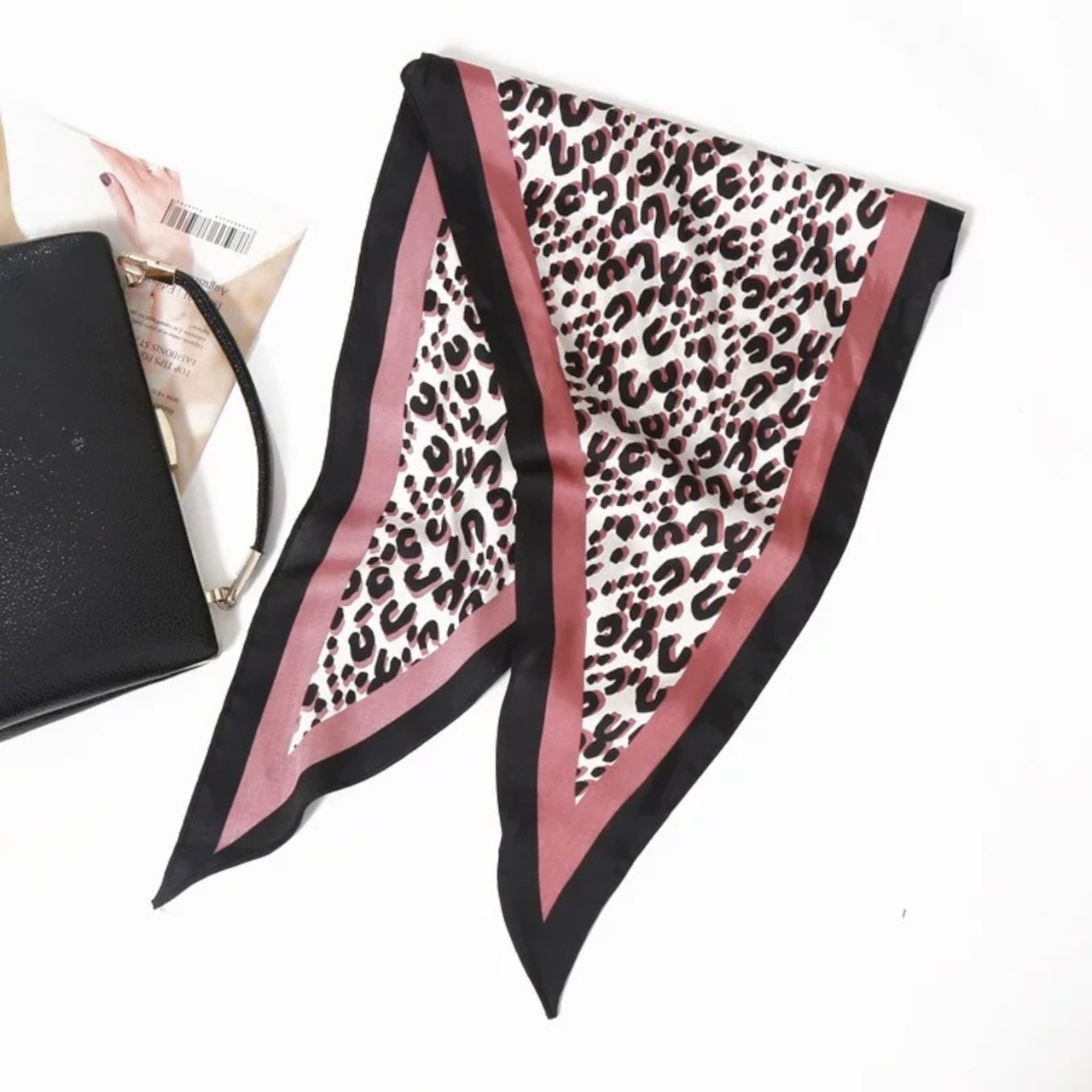 今年のトレンド、レオパード柄を取り入れたトライアングルスカーフ。
