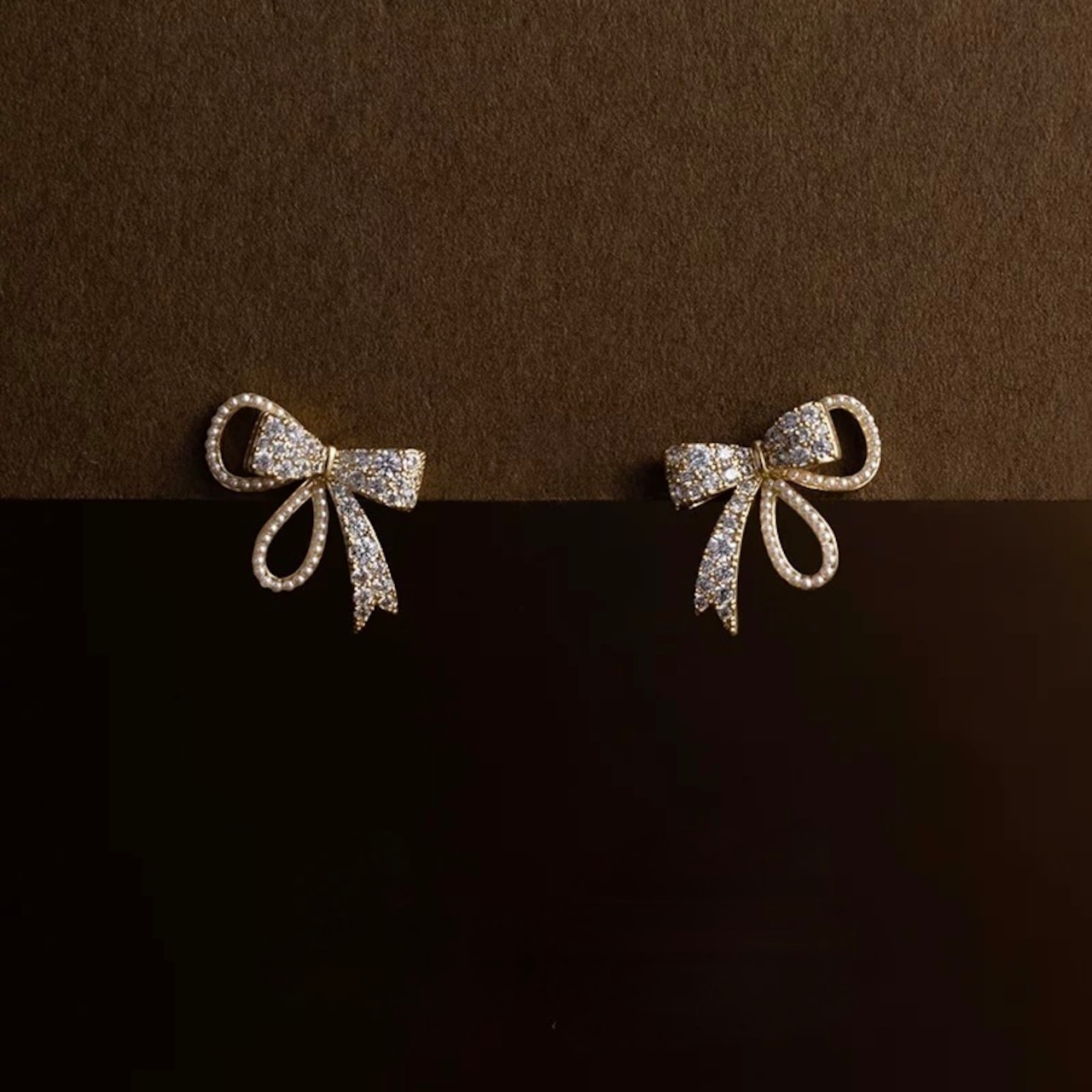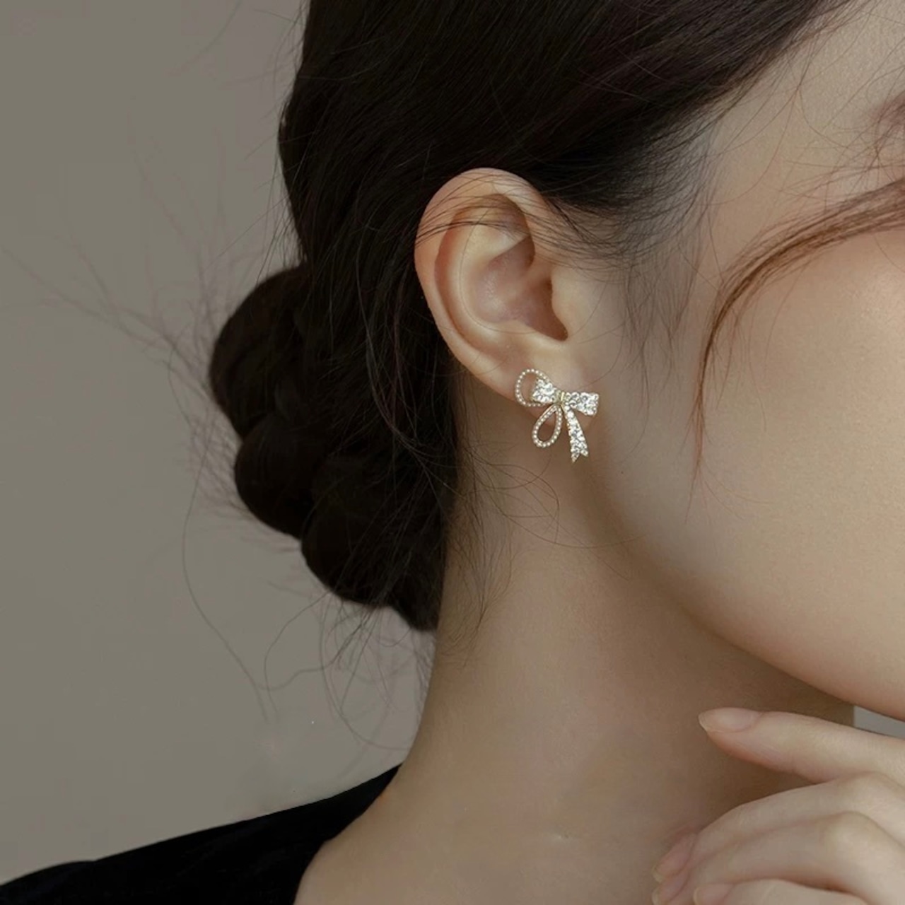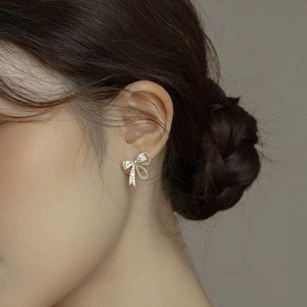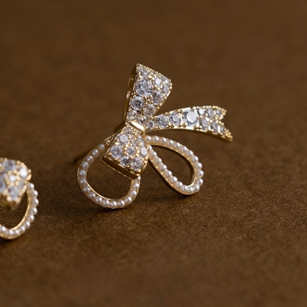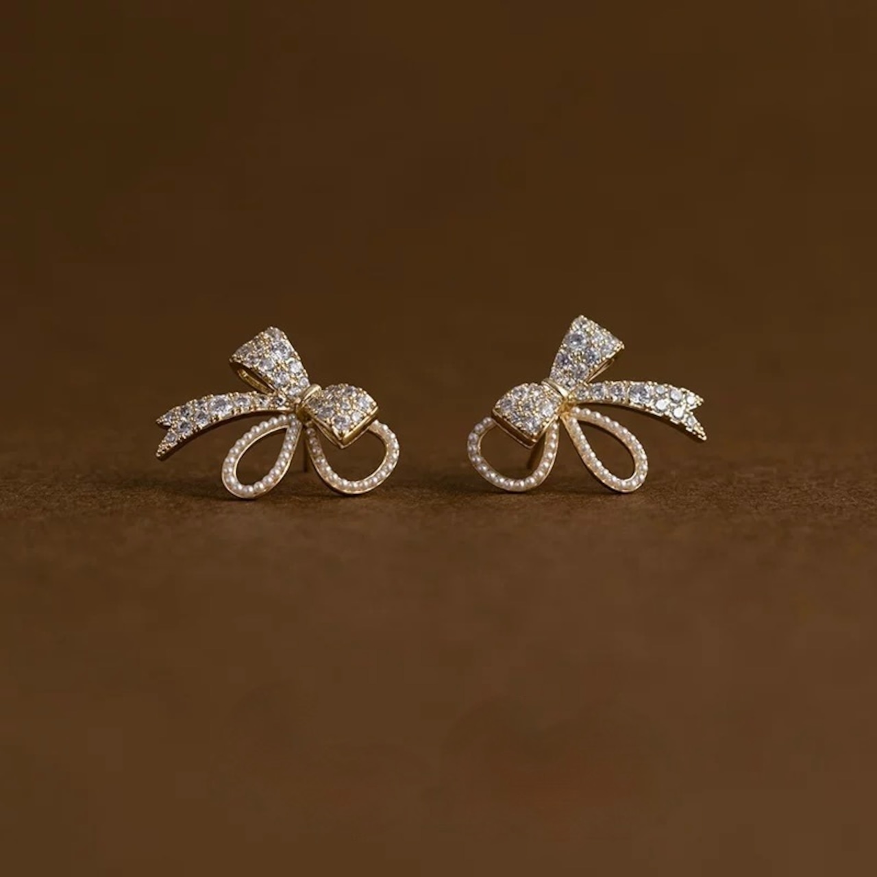 繊細なリボンモチーフに煌めくビジューをぎっしりとあしらった上品ピアス。