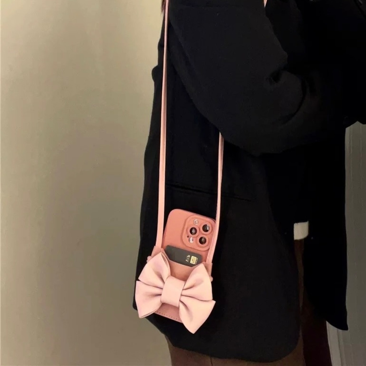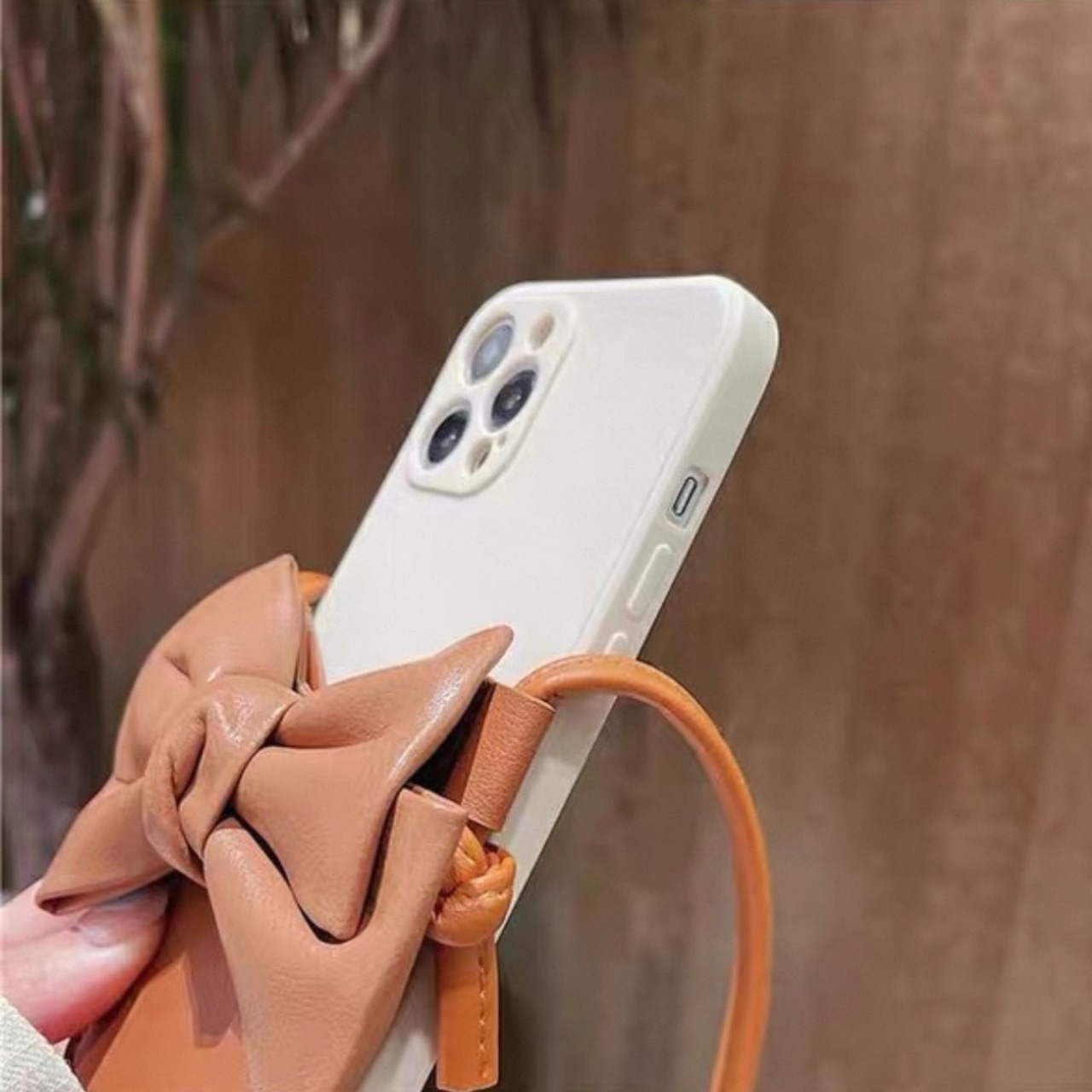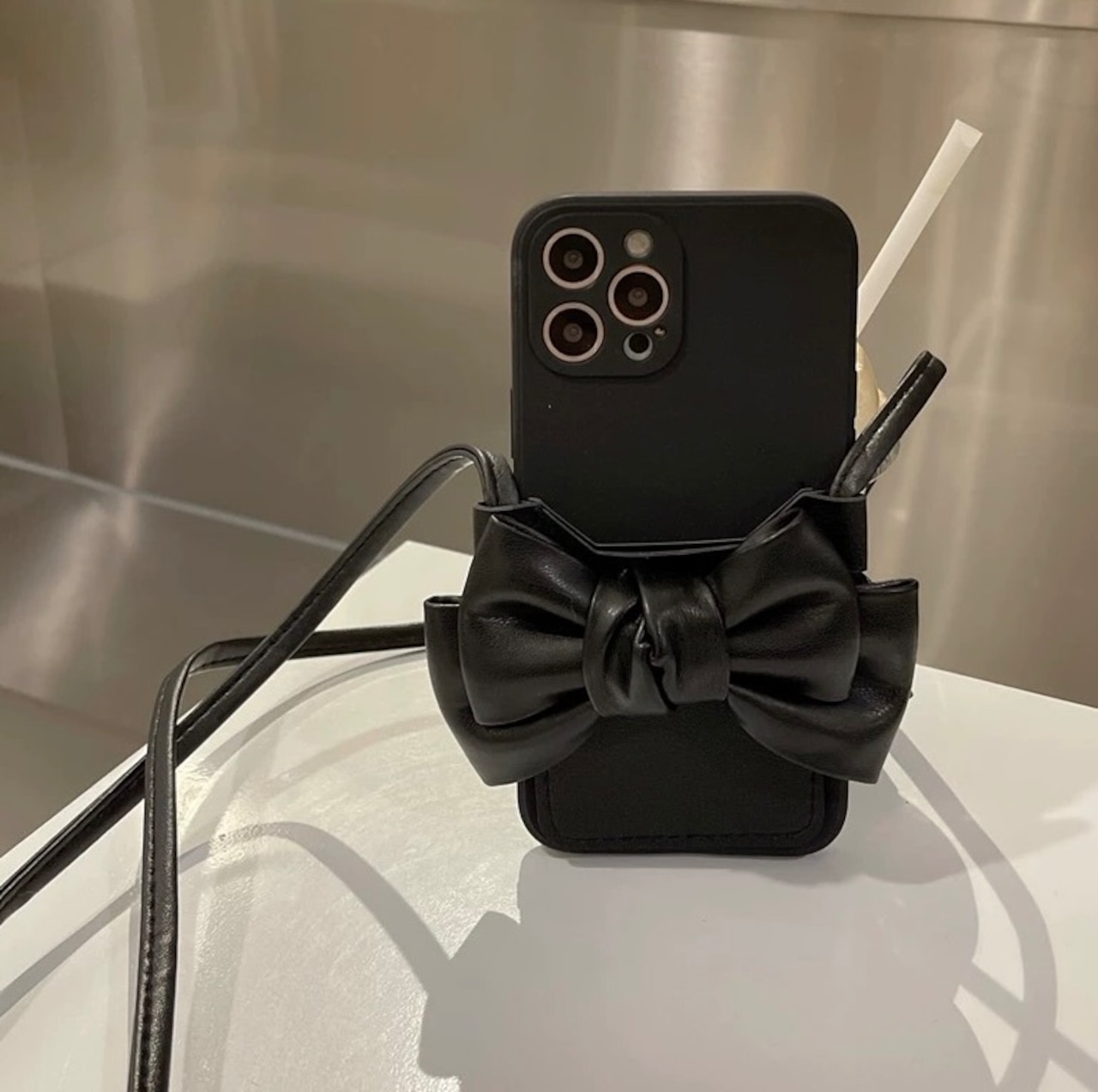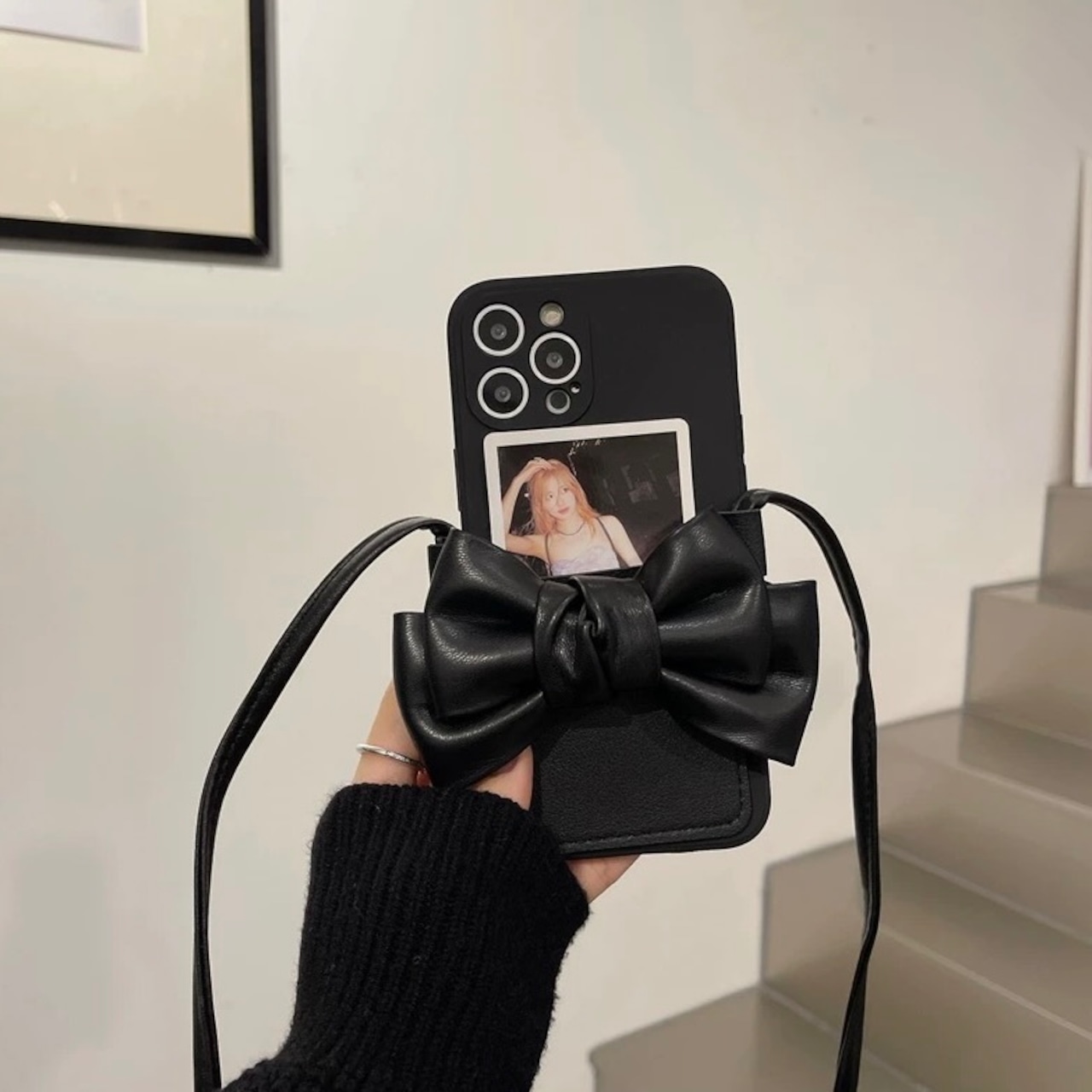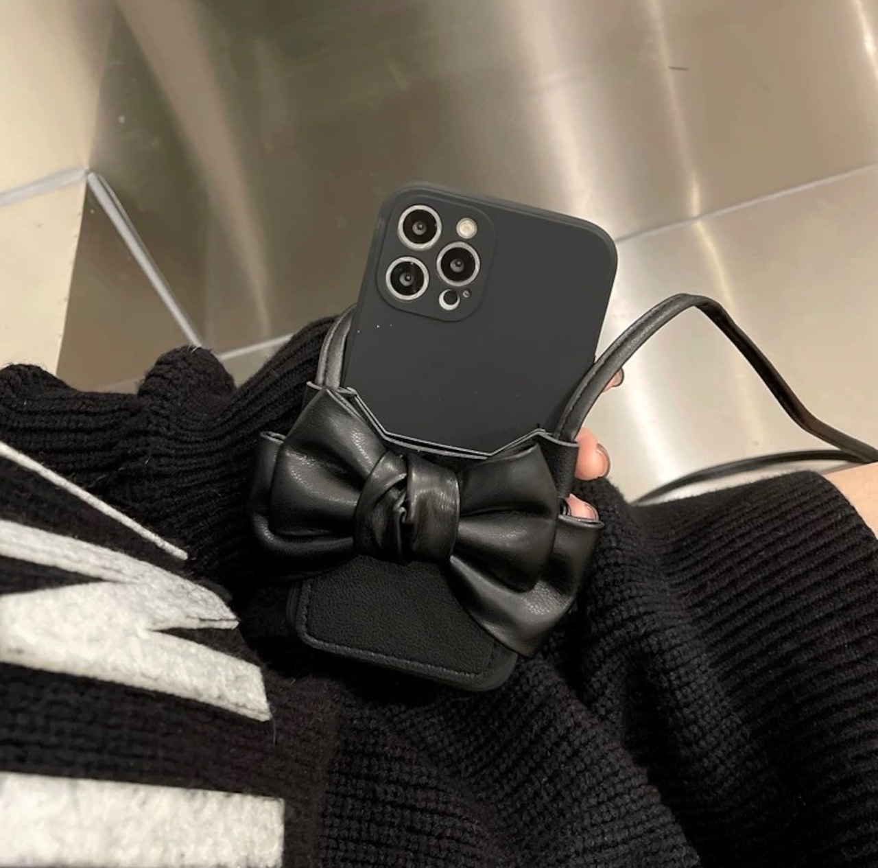 存在感たっぷりのビッグリボンが目を惹く、レザー調ショルダーiPhoneケース。