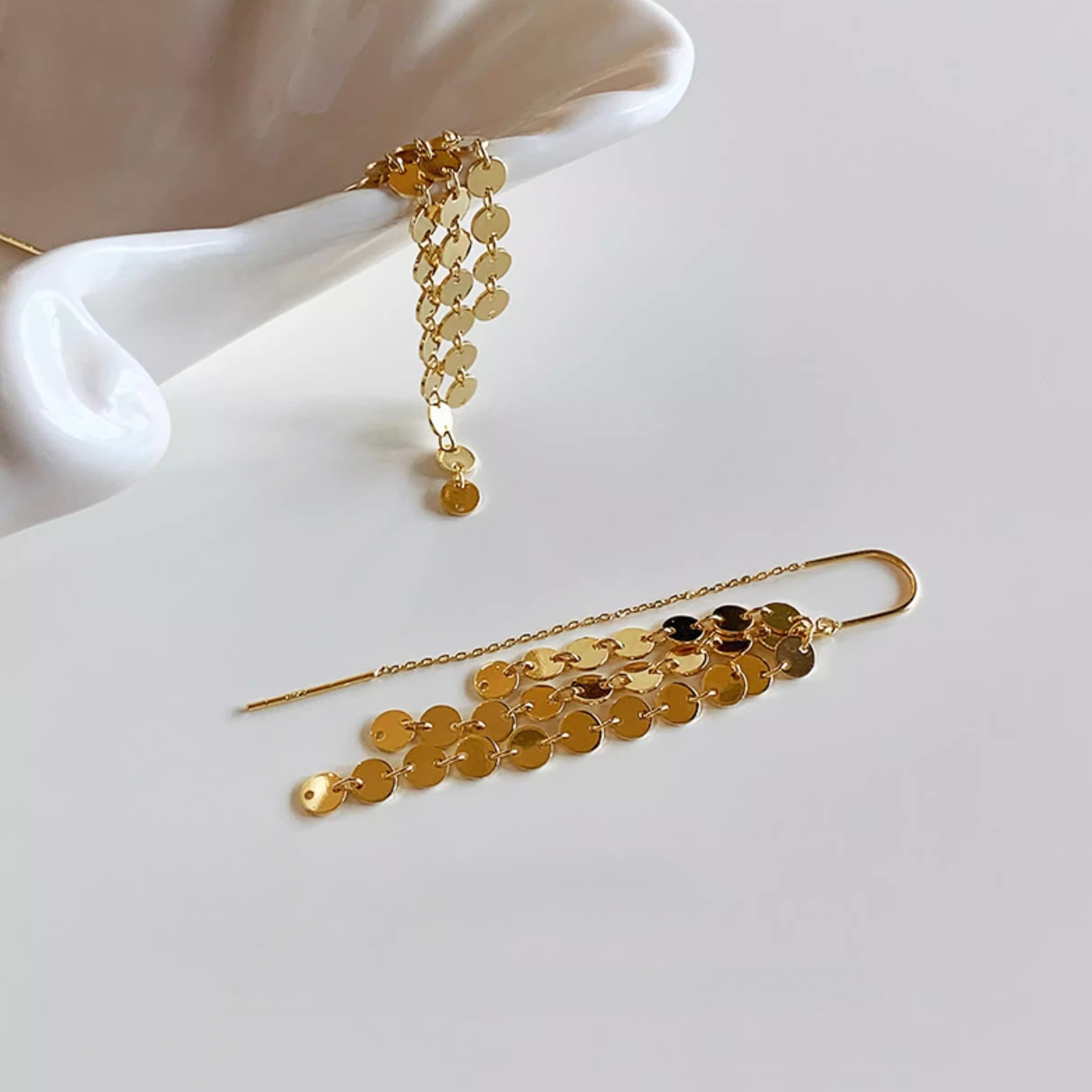 耳元で流れるように連なるコインモチーフが、上品な輝きと存在感を放つロングピアスです。