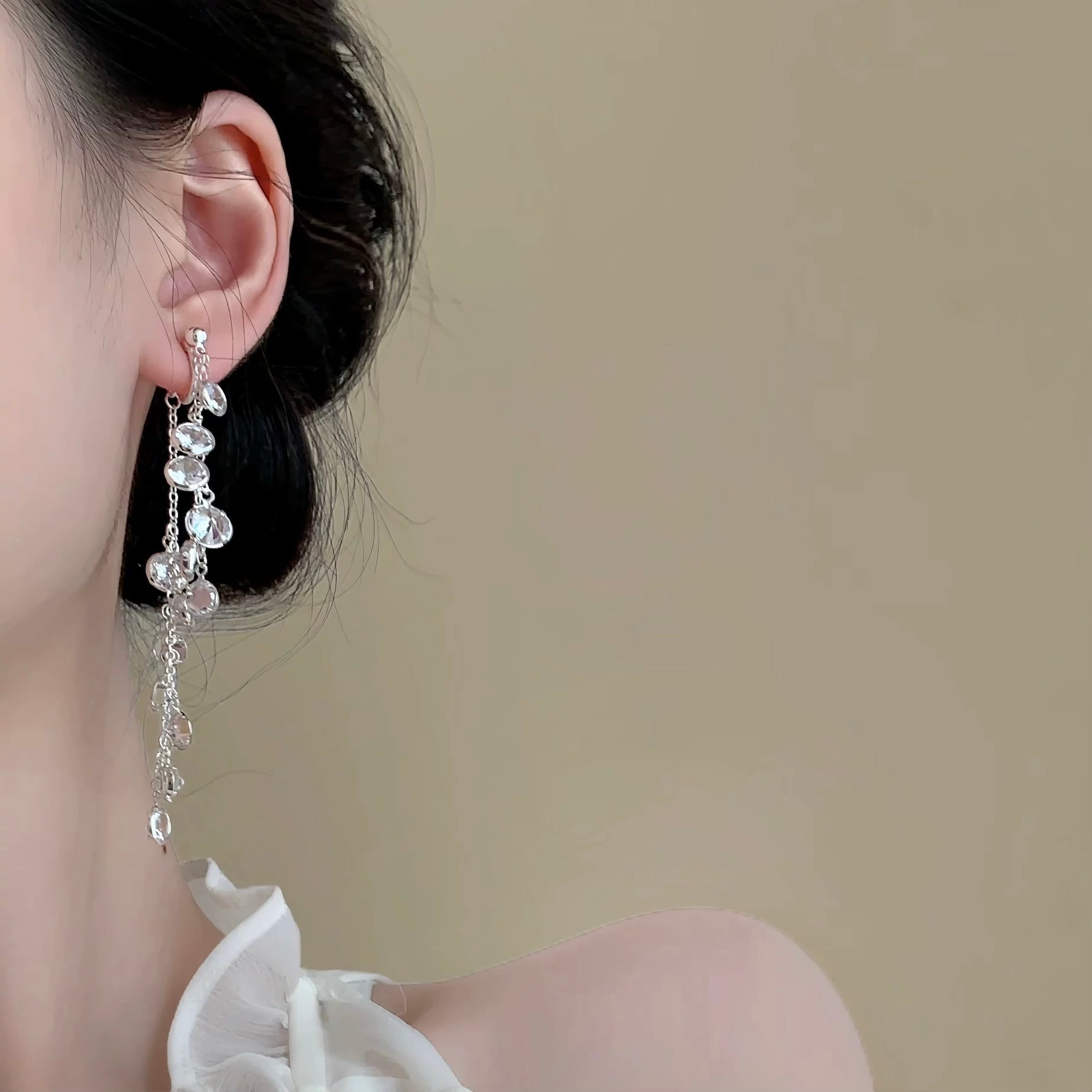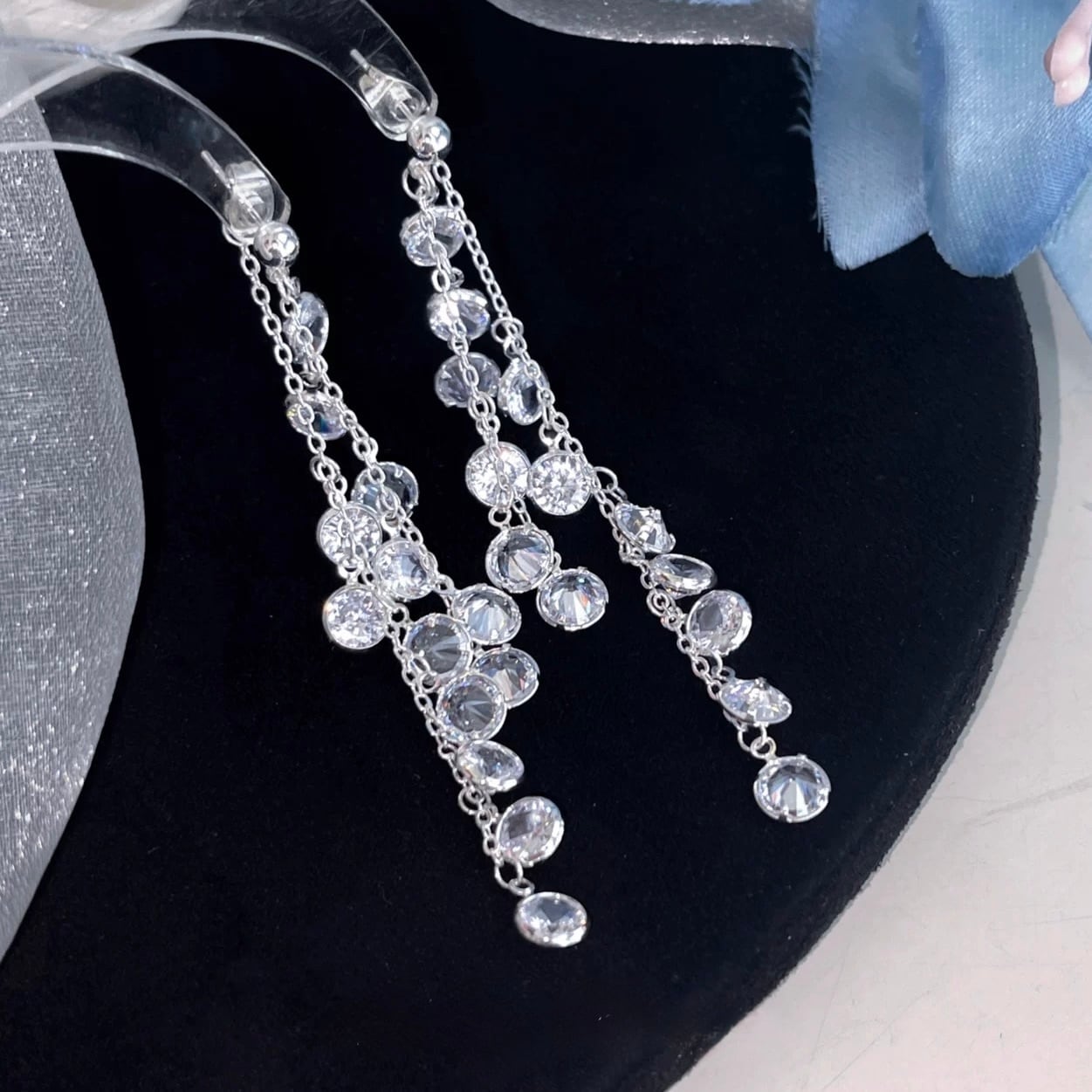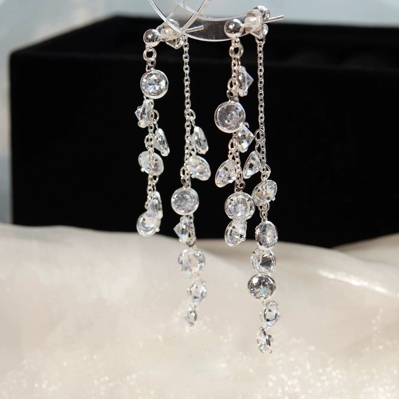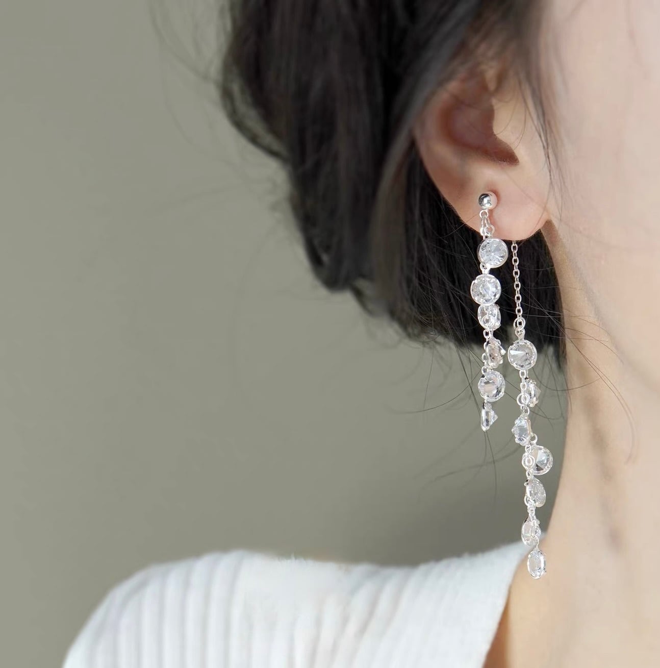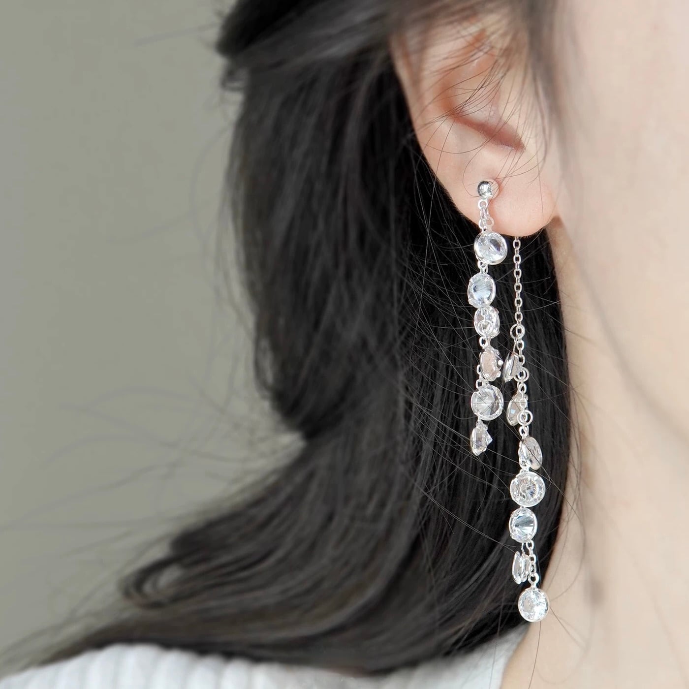 キュービックジルコニアを繊細なチェーンに3段階で連ねた、存在感たっぷりのロングピアス/イヤリングです。