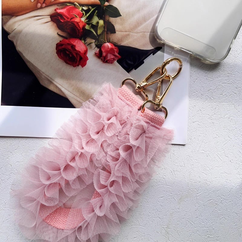 繊細なフリルデザインとゴールドの金具が、バッグやスマホケースを一瞬でフェミニンにドレスアップしてくれます。