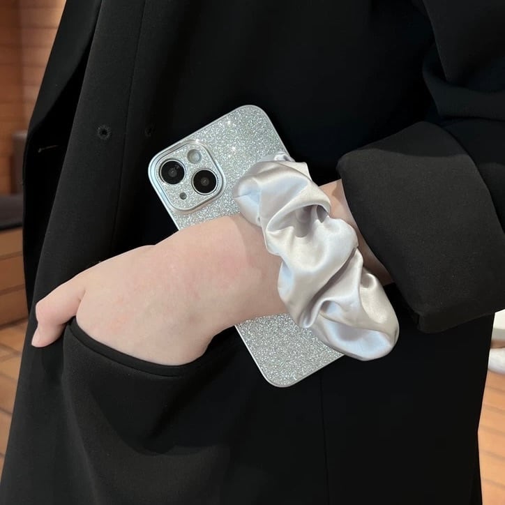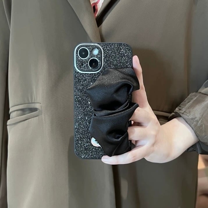 キラキラと輝くラメデザインに、艶やかなサテンリボンを組み合わせた上品なiPhoneケース。