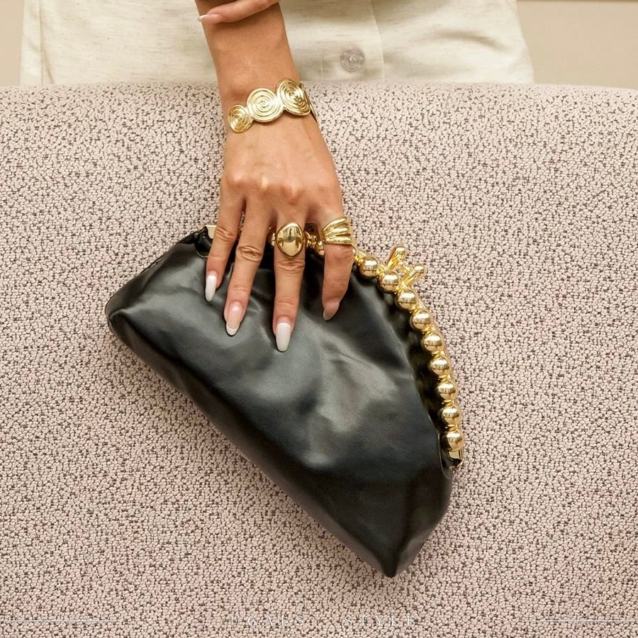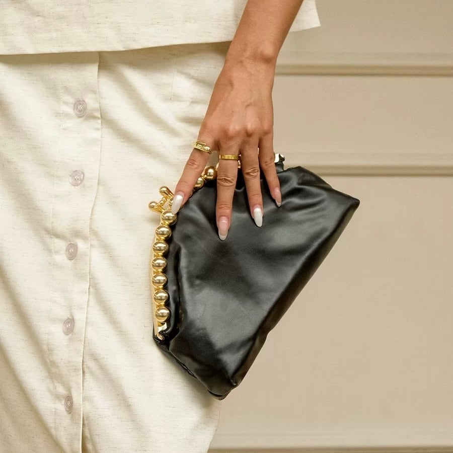 光を受けて上品に輝く、ゴールドビーズのハンドルが印象的なクラッチバッグ。