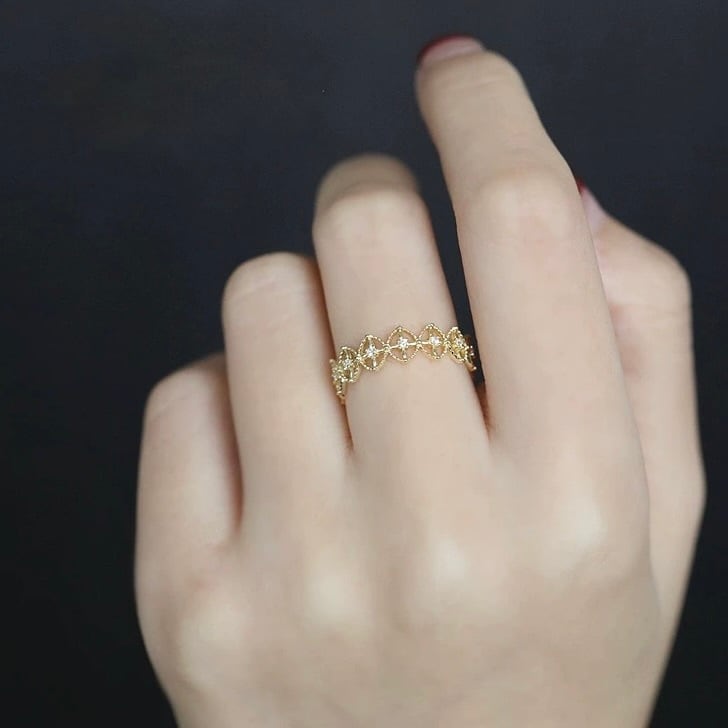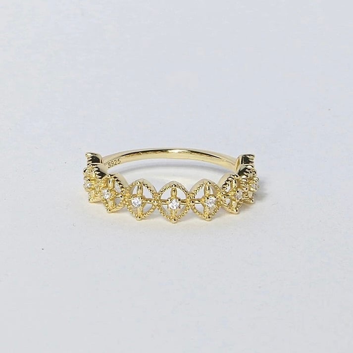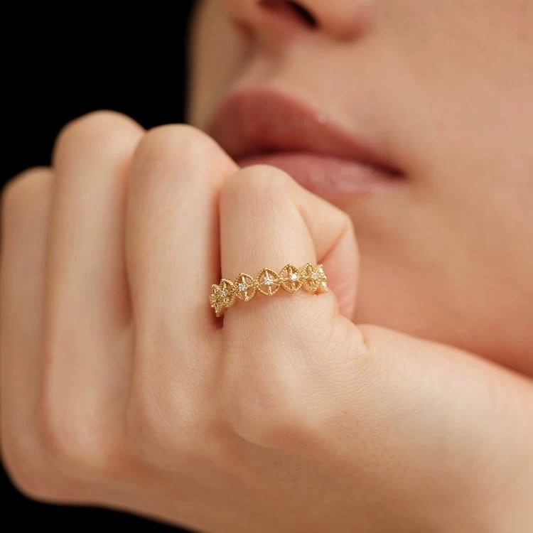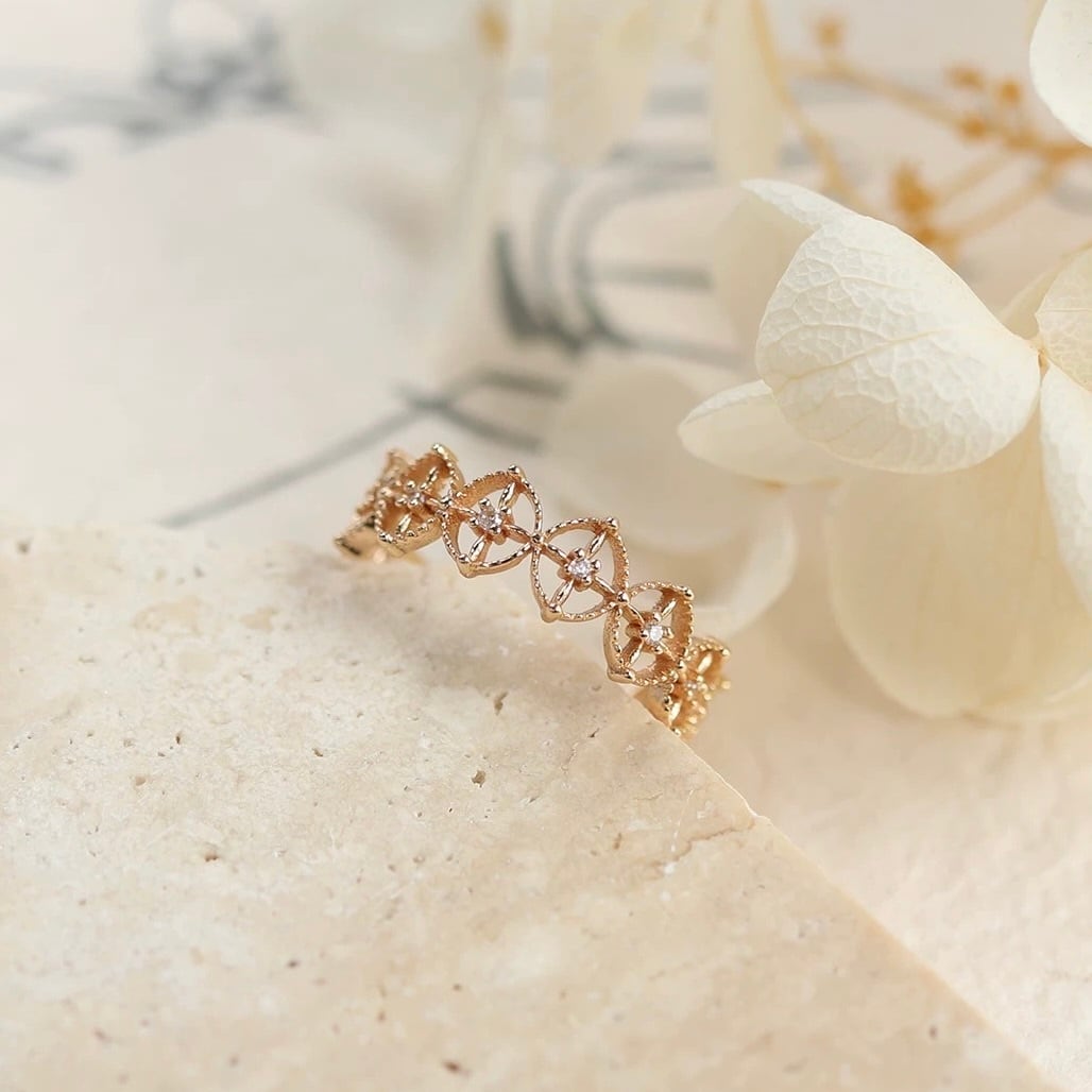 繊細なレースのように連なるフラワーモチーフが、指先に上品な輝きを添えるデザインリング。