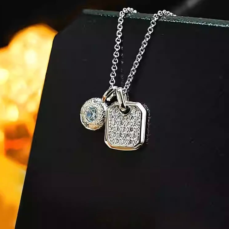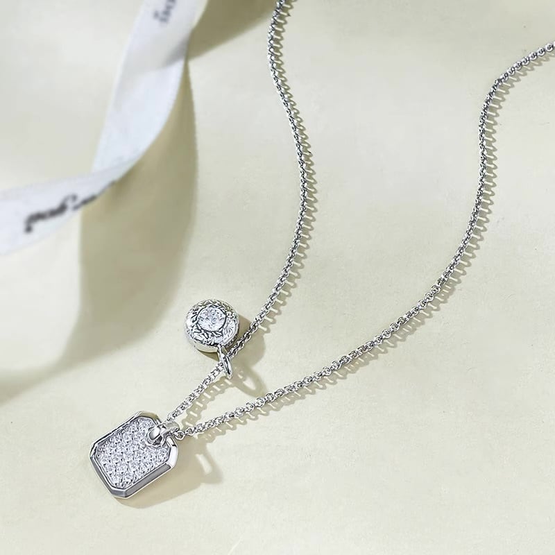 華やかなパヴェチャームと繊細なカットストーンの2チャームが胸元で上品に揺れ、