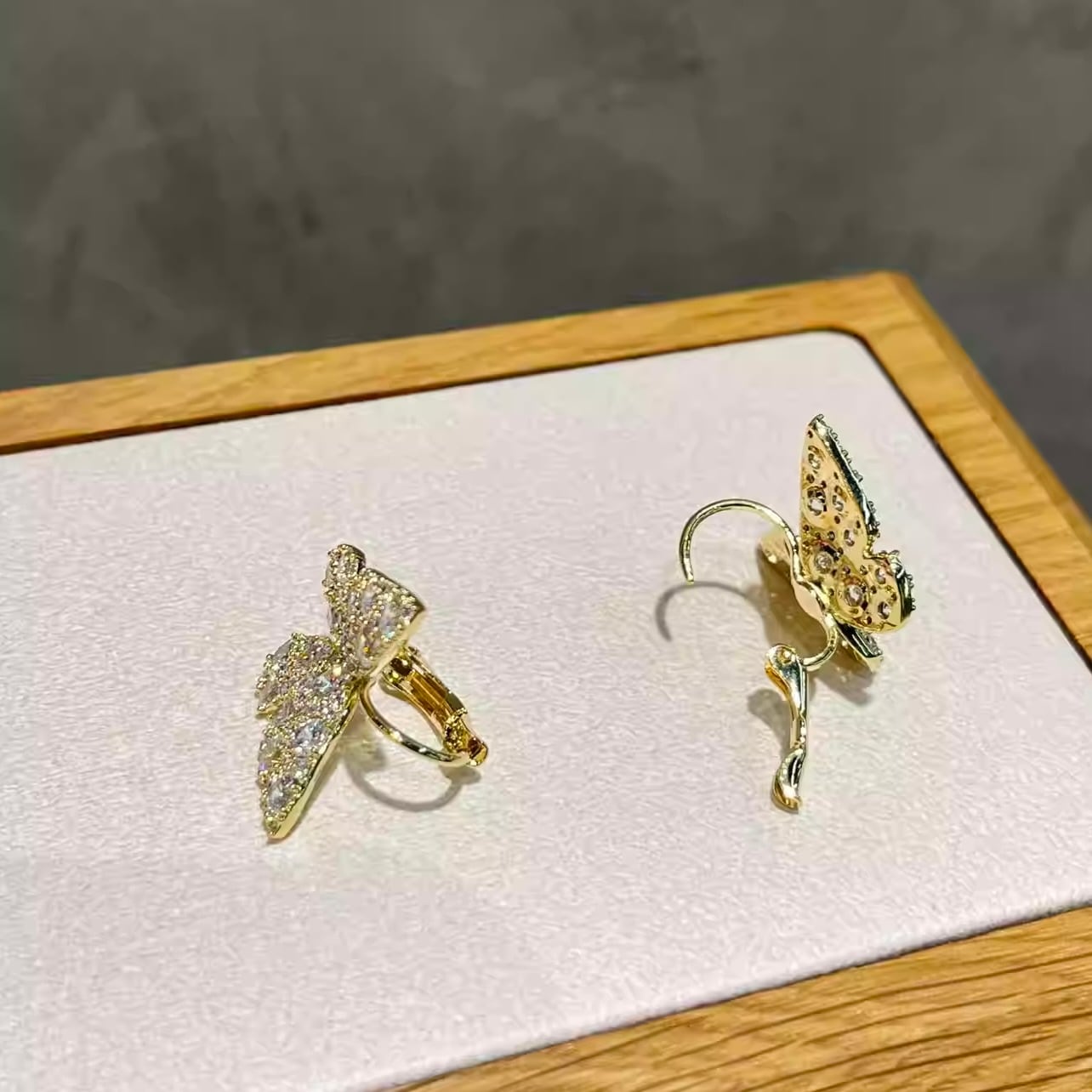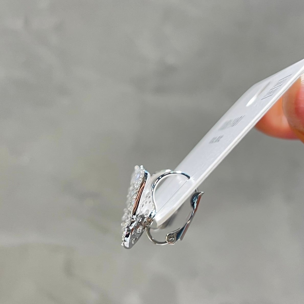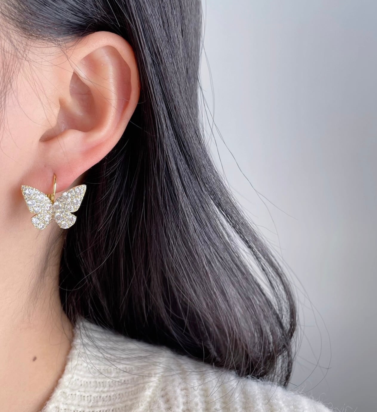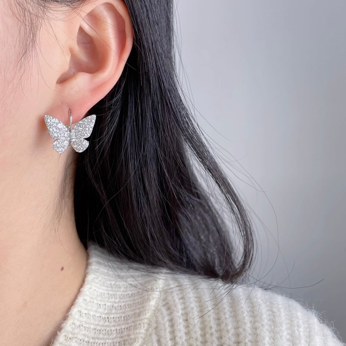 舞い上がる蝶のシルエットに、びっしり敷き詰められたジルコニアが煌めく、存在感抜群のバタフライピアス。