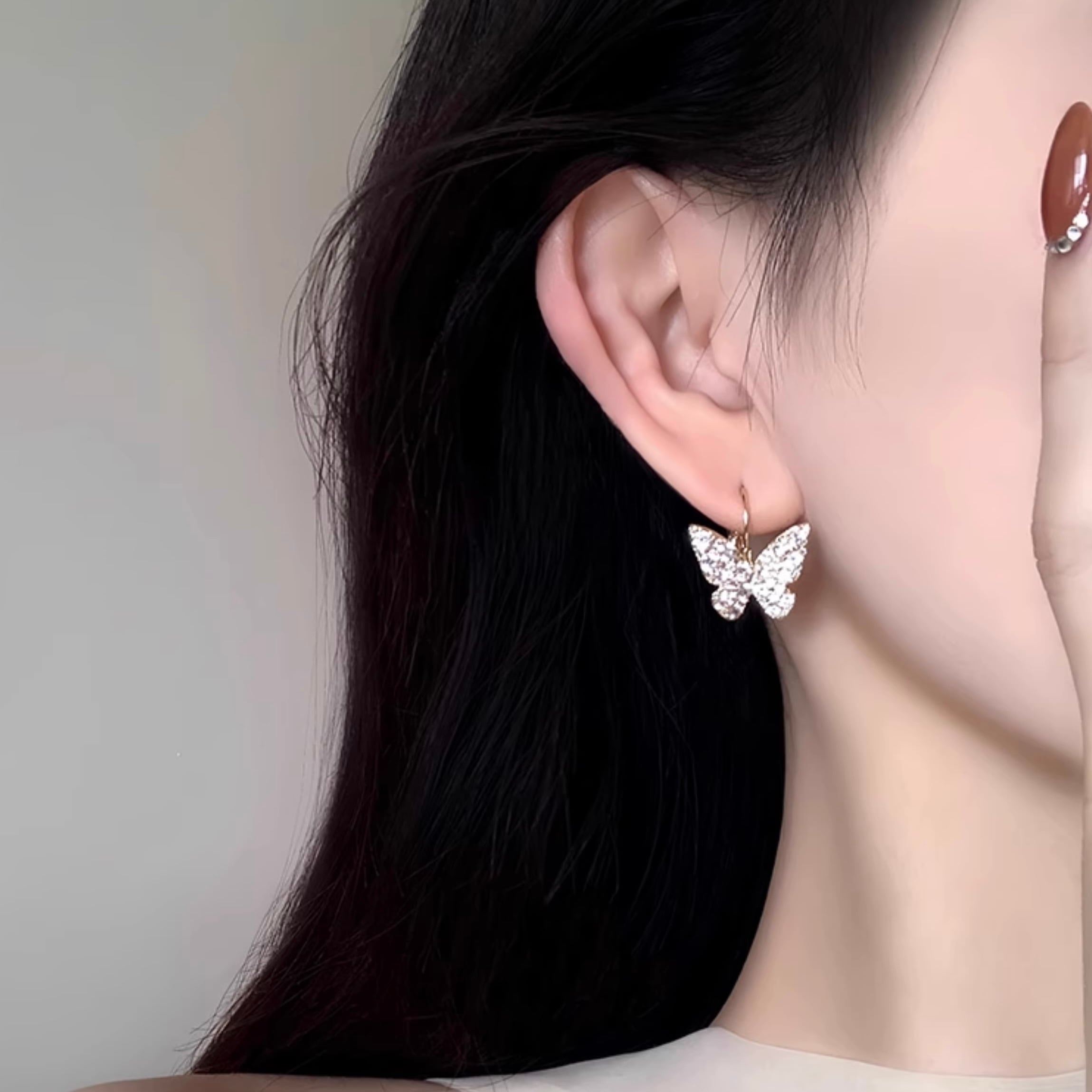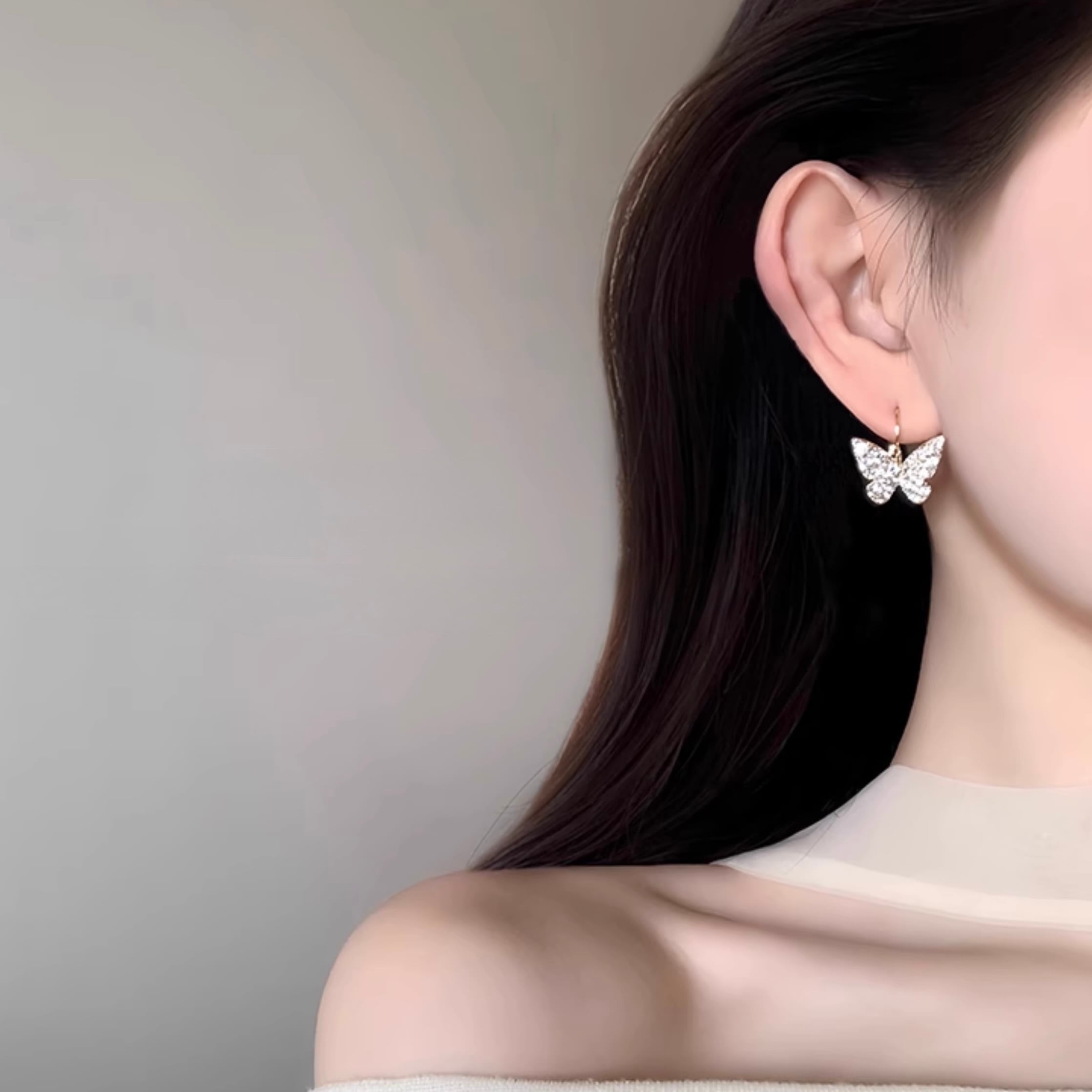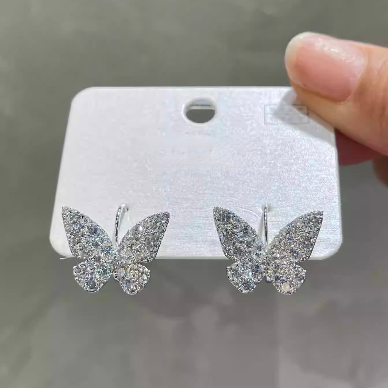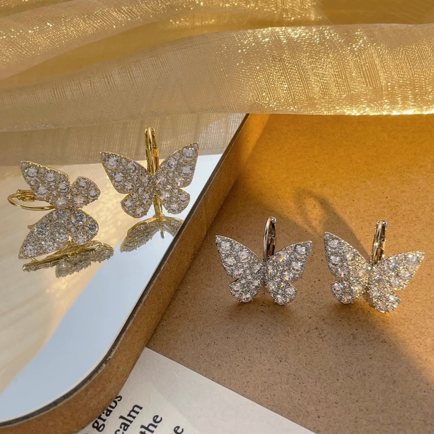 舞い上がる蝶のシルエットに、びっしり敷き詰められたジルコニアが煌めく、存在感抜群のバタフライピアス。