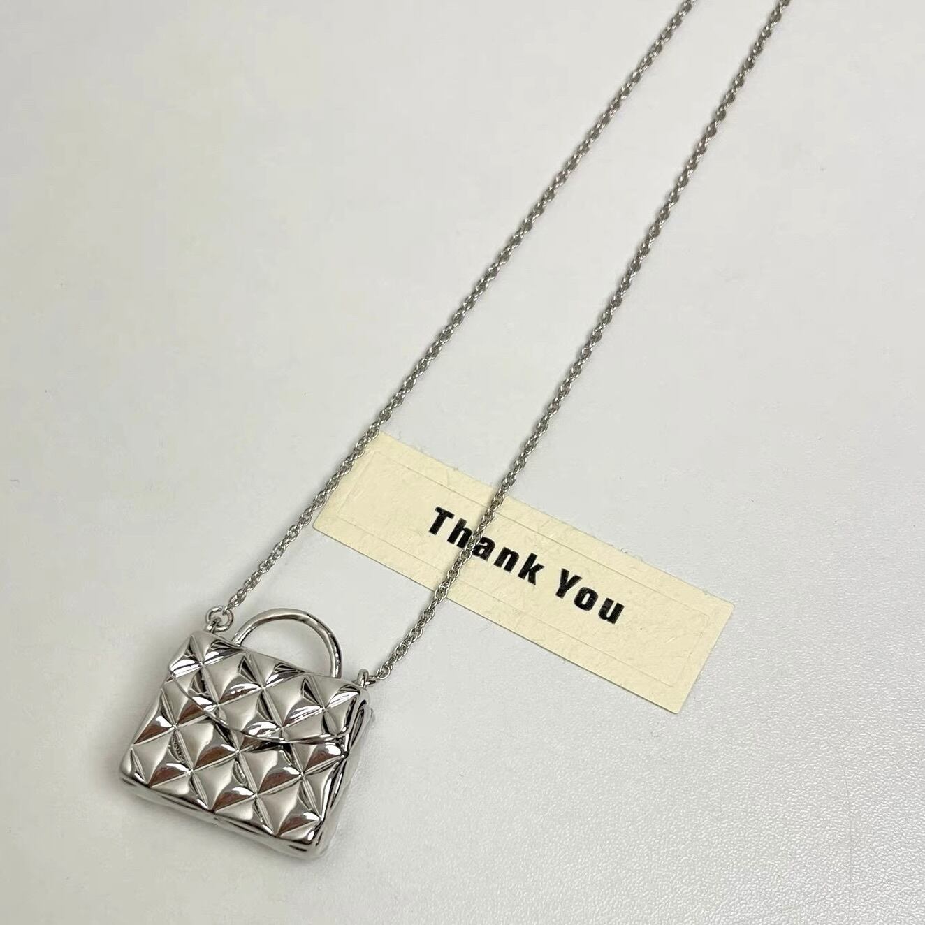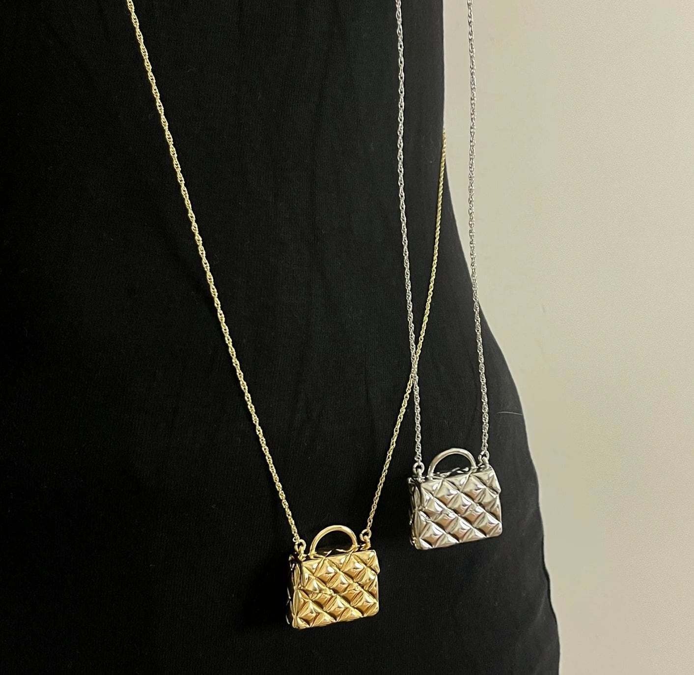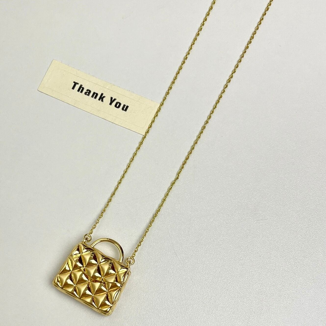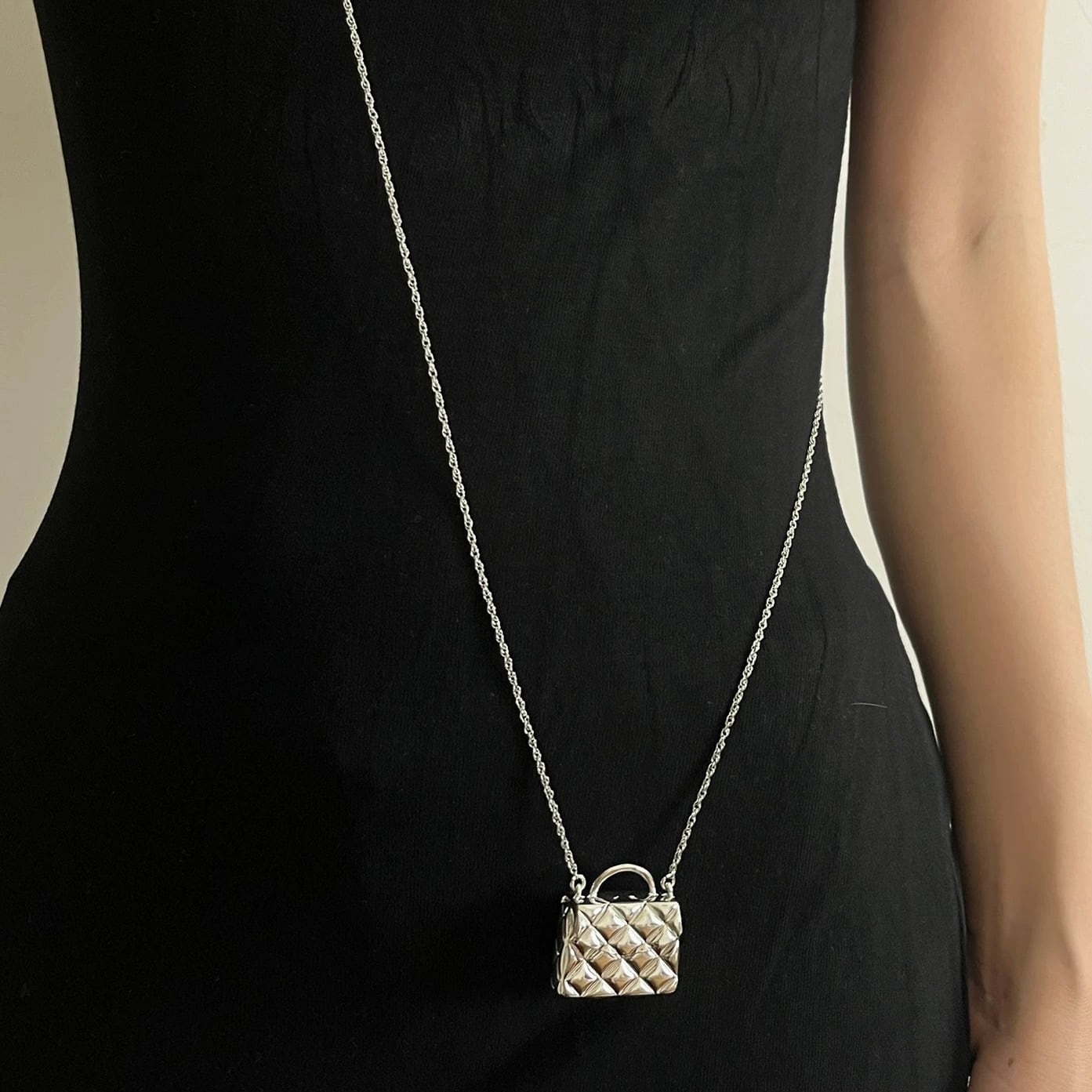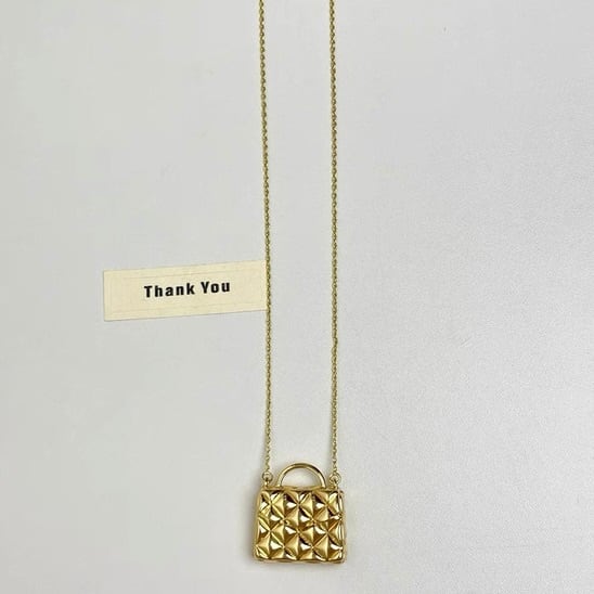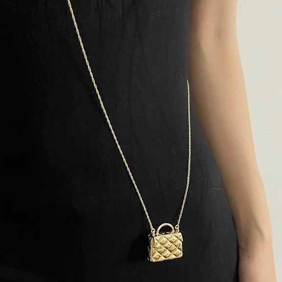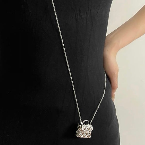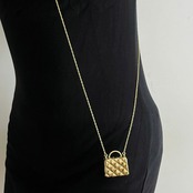 まるで小さなジュエリーバッグを身につけているかのような、立体感のあるキルティングデザインが目を惹くネックレス。