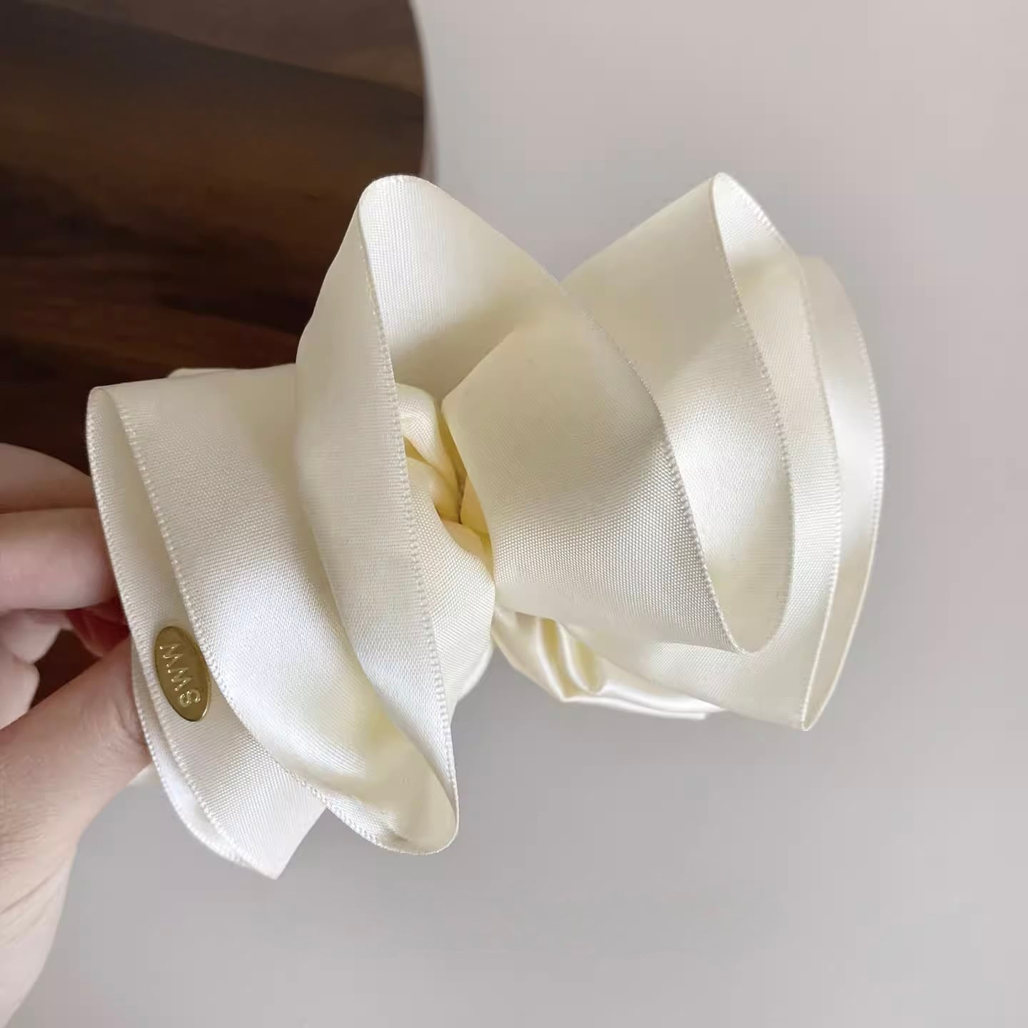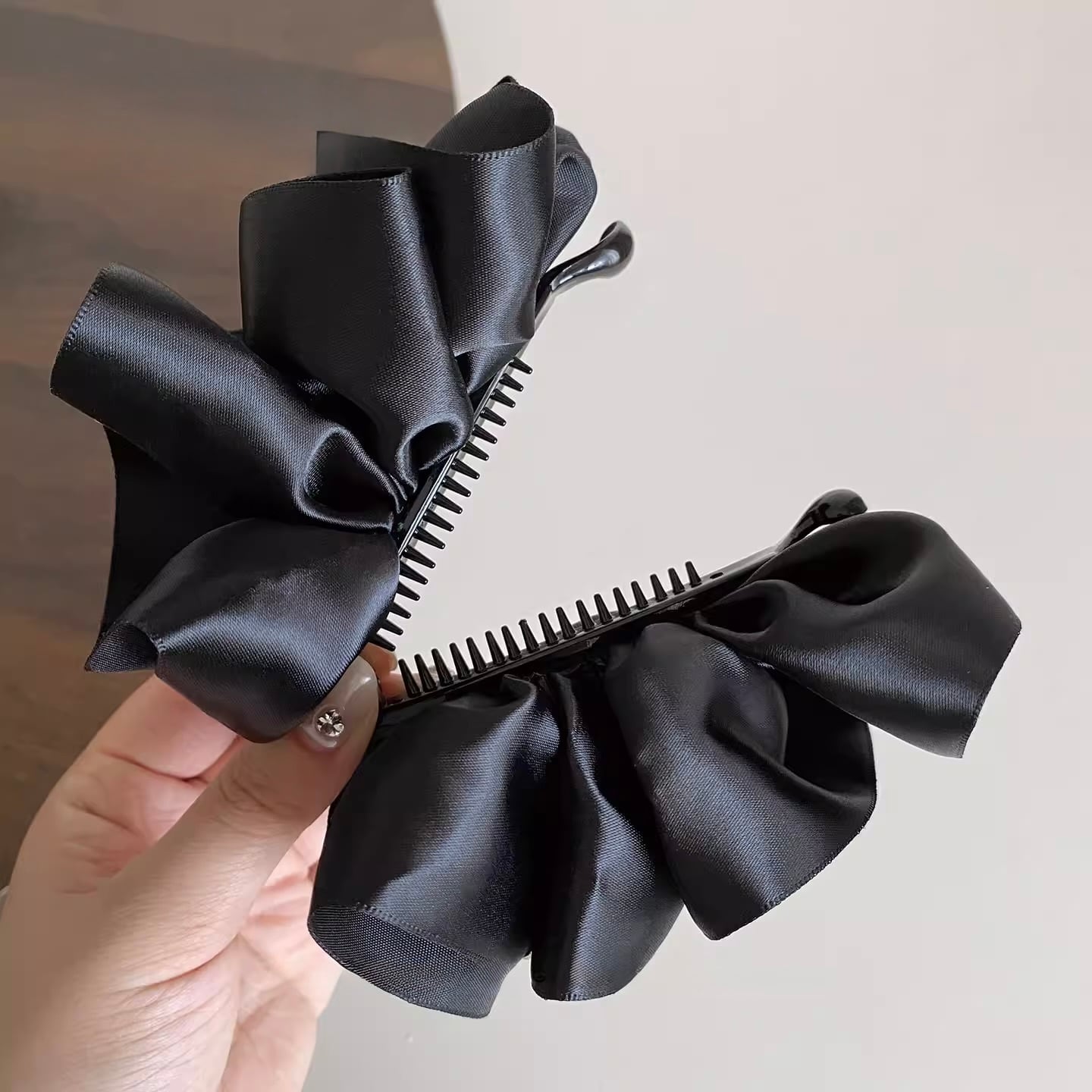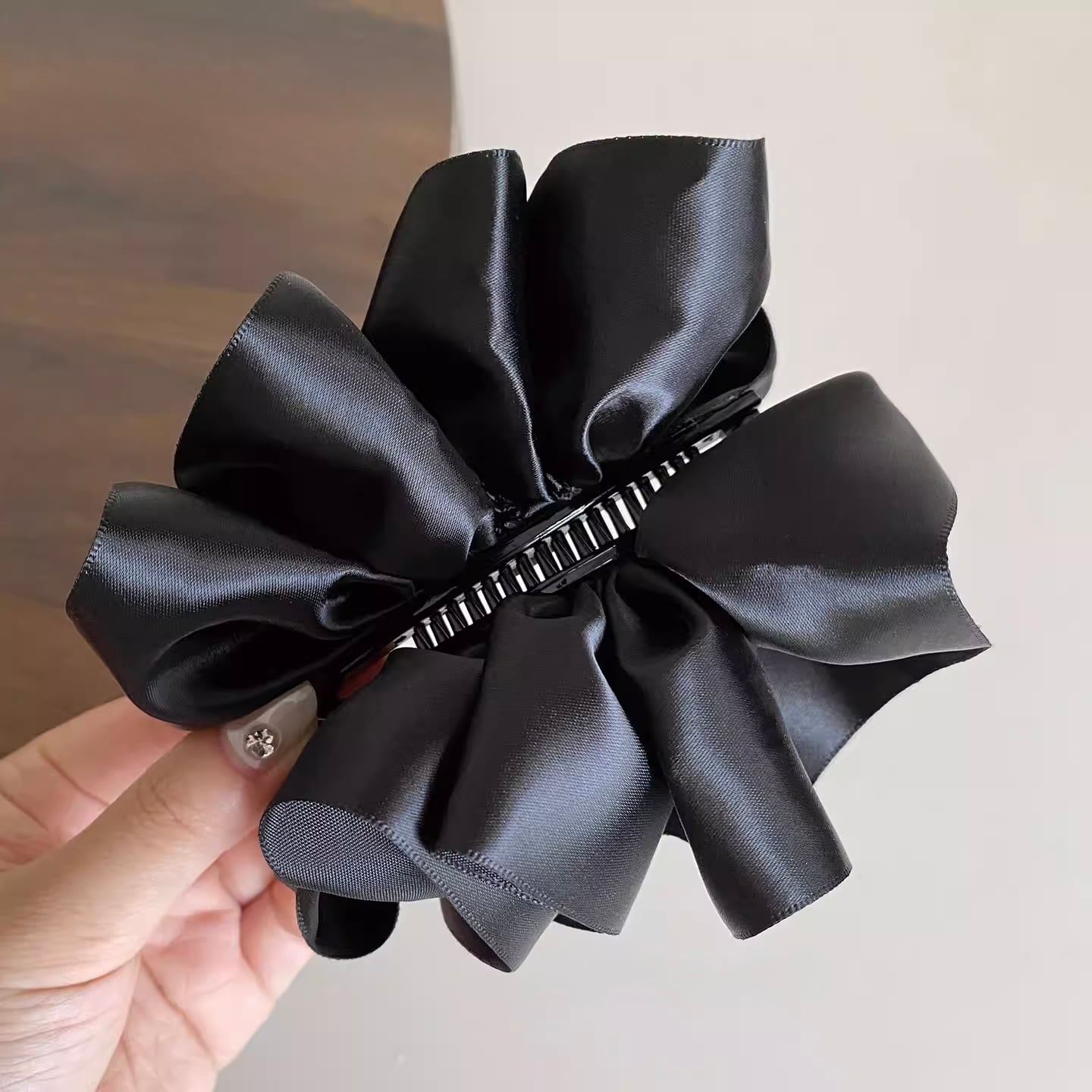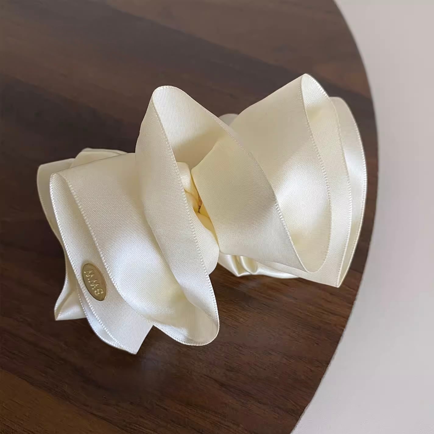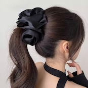 艶やかなサテン素材で仕立てた、存在感のあるビッグリボンのバナナクリップ。
