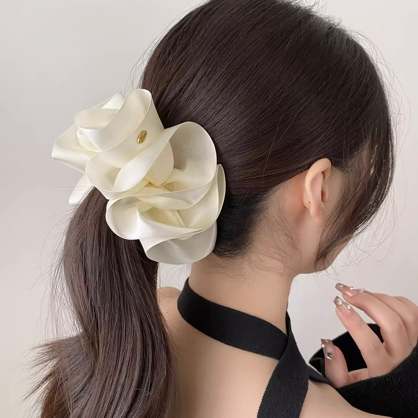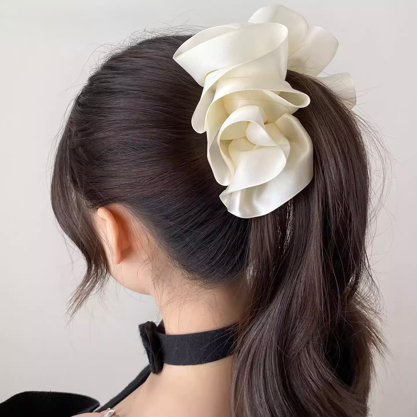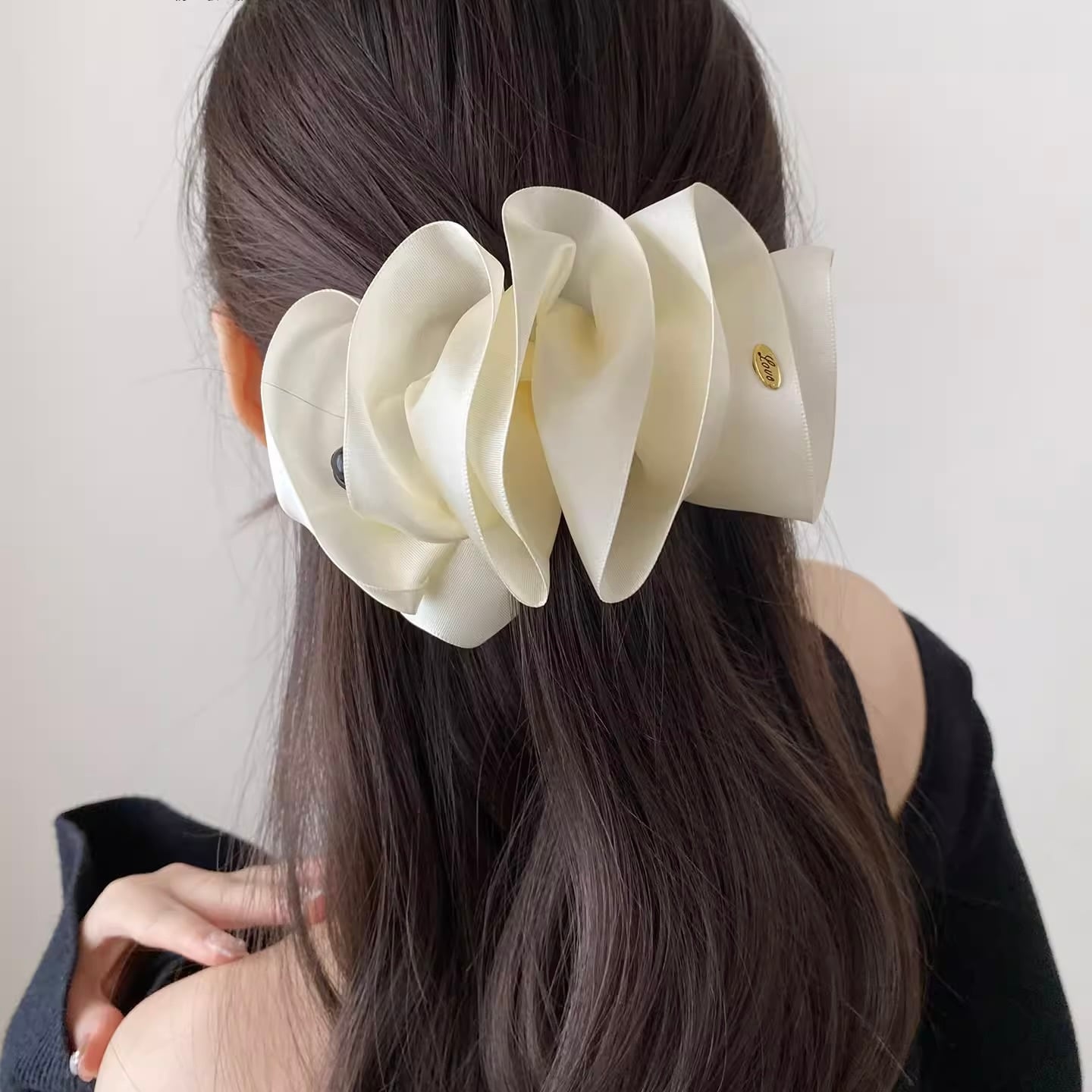 立体的に重なるリボンが上品な華やかさを演出し、まとめ髪を一瞬でエレガントなスタイルに。