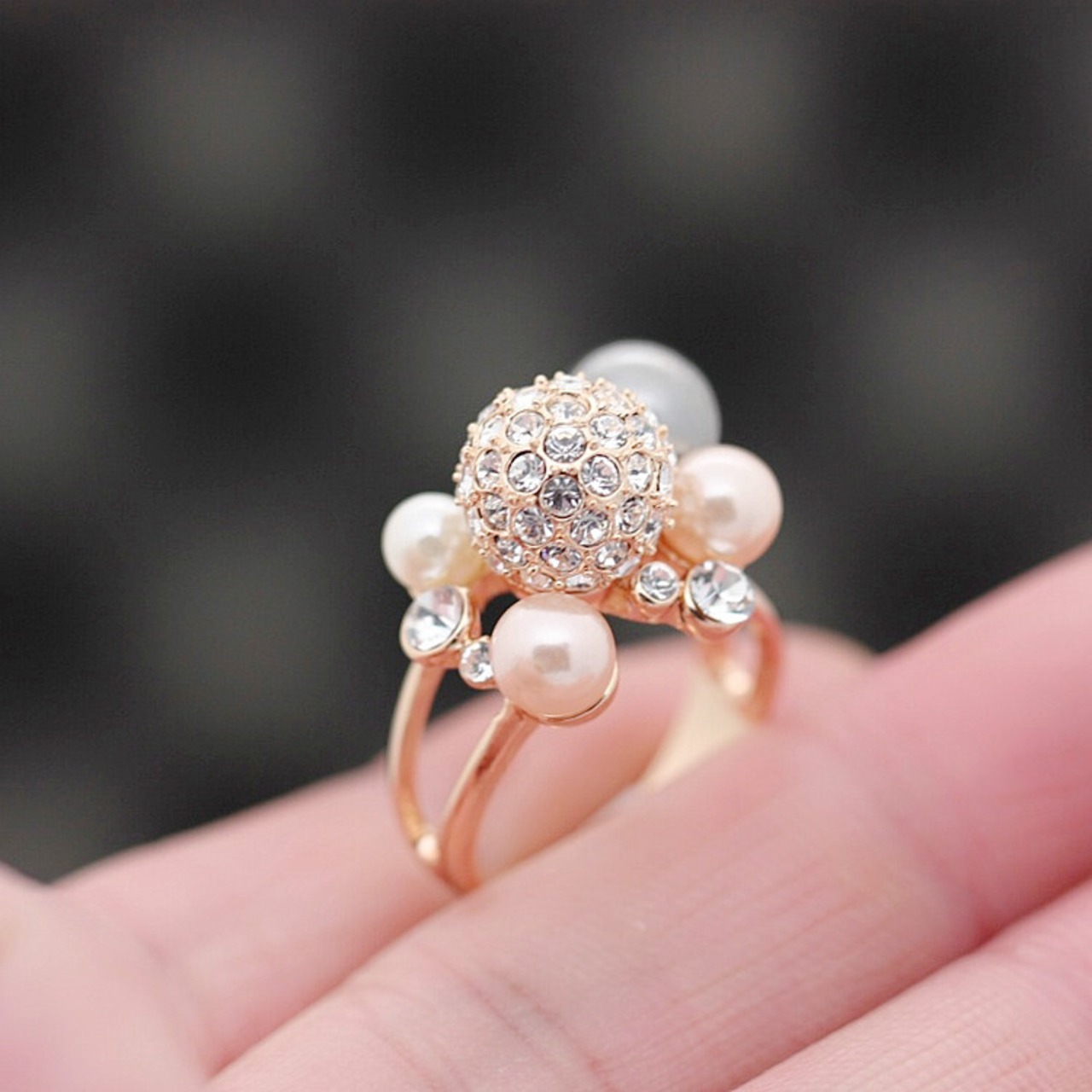 大小のパールと煌めくビジューがリズミカルに配された、華やかで愛らしいデザインの「ブリリアントパールドームリング」。