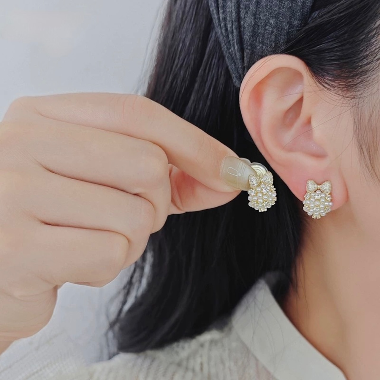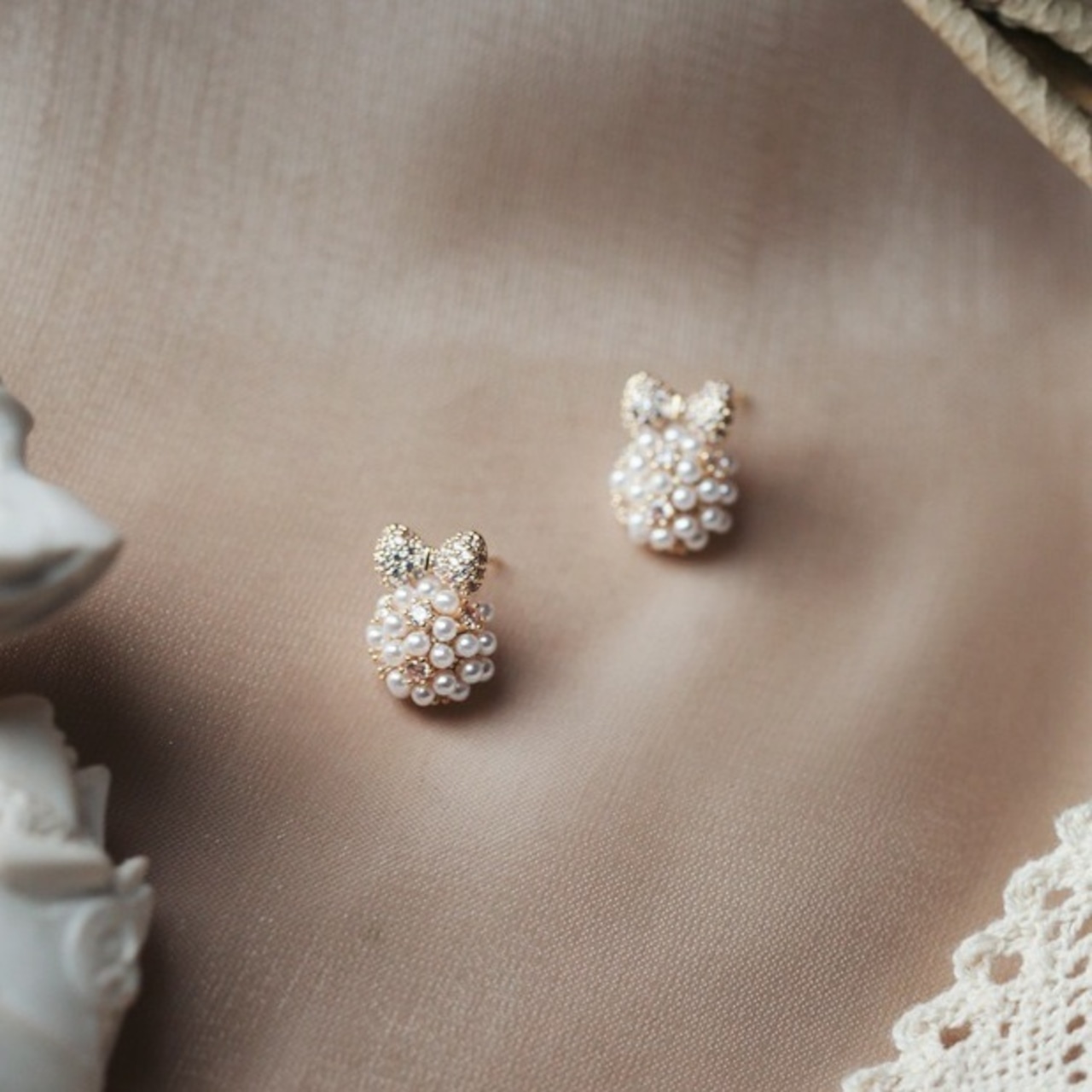 繊細なリボンモチーフと小粒パールを贅沢にあしらった、上品で華やかなピアス。まるで花束のように丸く立体的に仕上げられたパールのクラスターが、動くたびにやさしく揺れて女性らしさを引き立てます。