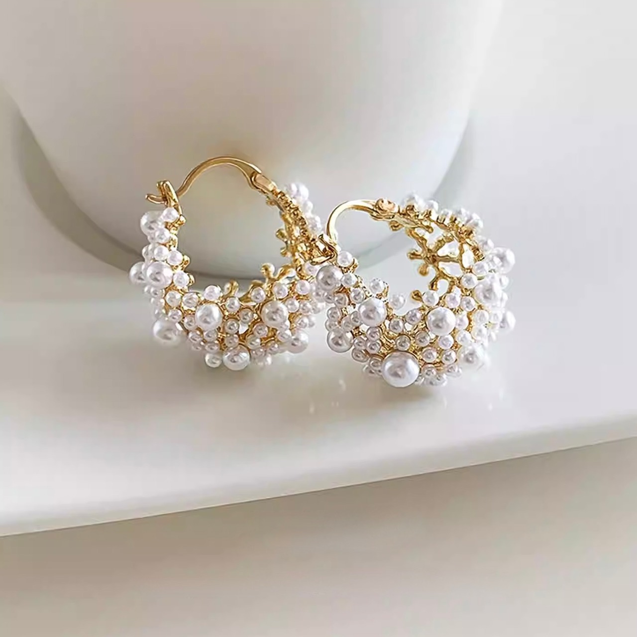 大小さまざまなパールを繊細に編み込んだ、ボリューム感のあるフープピアス。